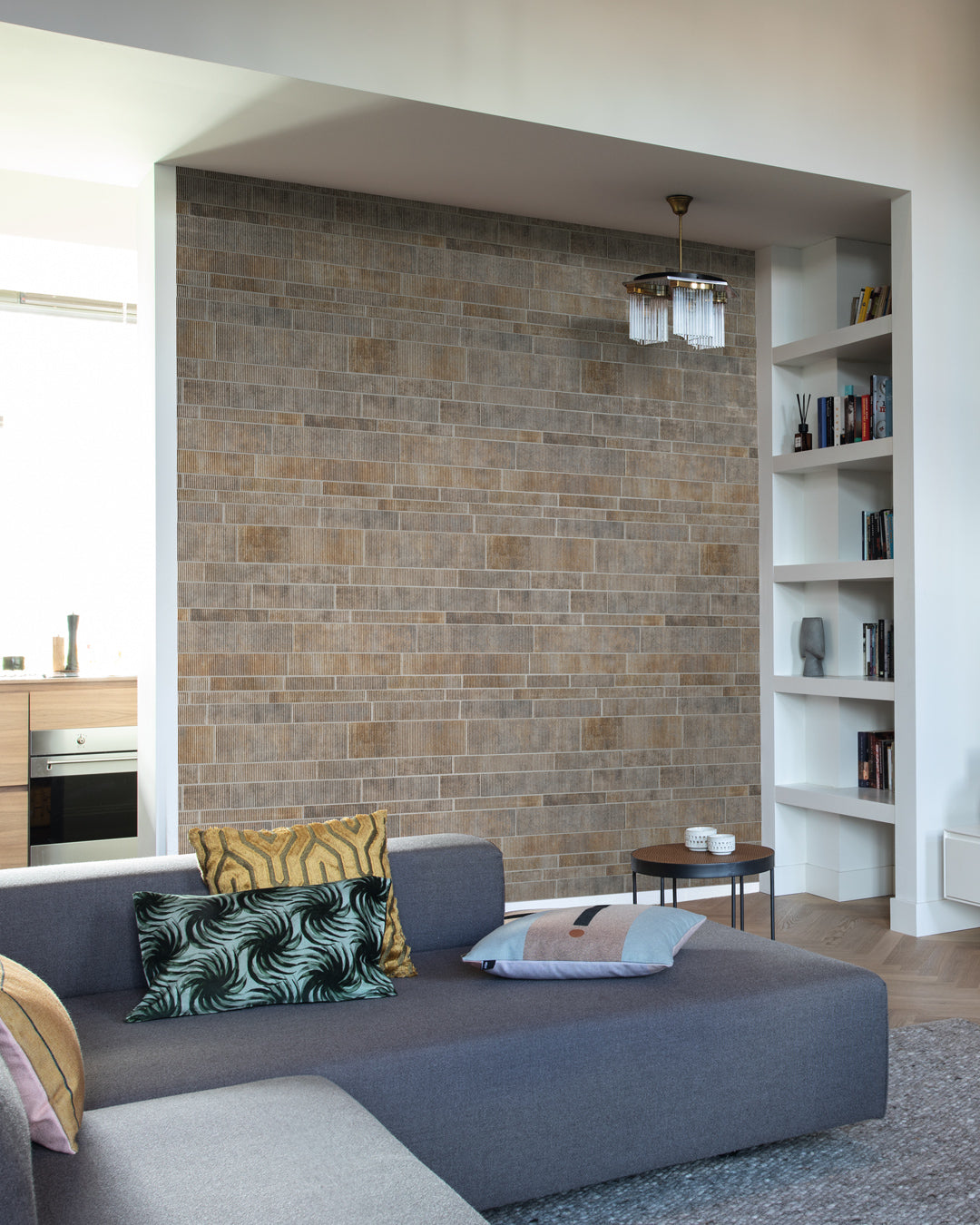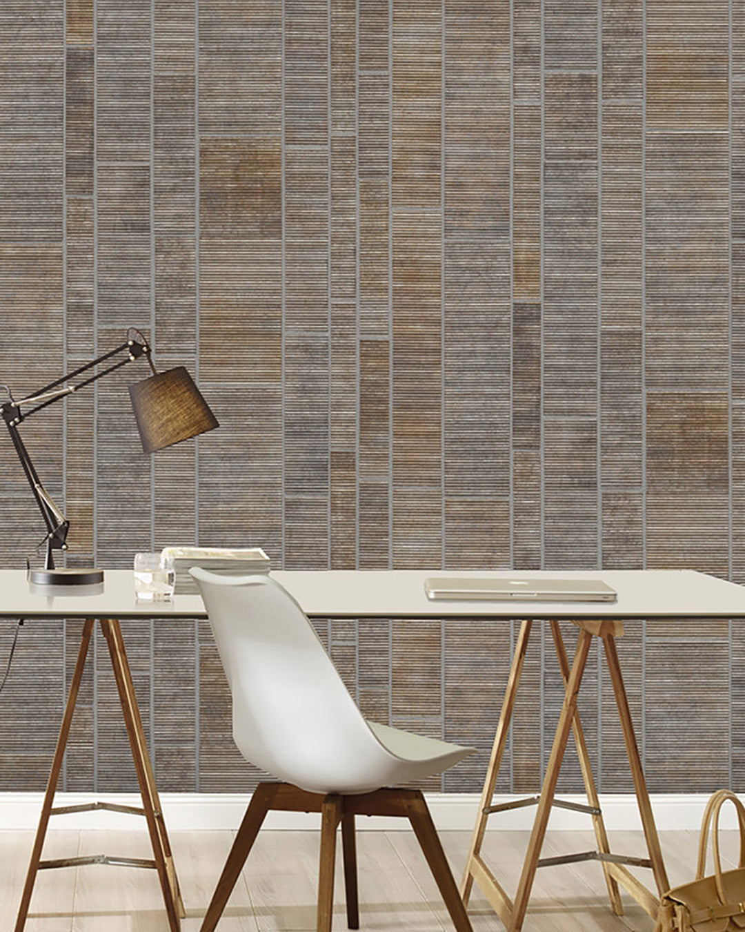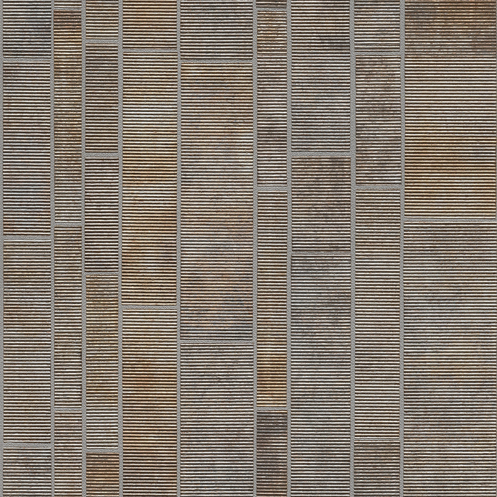 Reflekterande metallicfärgad tapet som skiftar i jordnära färger som silver och rostbrunt. De rektangulära, kakelformade mönstret passar både horisontellt och vertikalt. Tapeten har en unik dimensionell yta som charmigt och subtilt reflekterar ljuset i rummet.