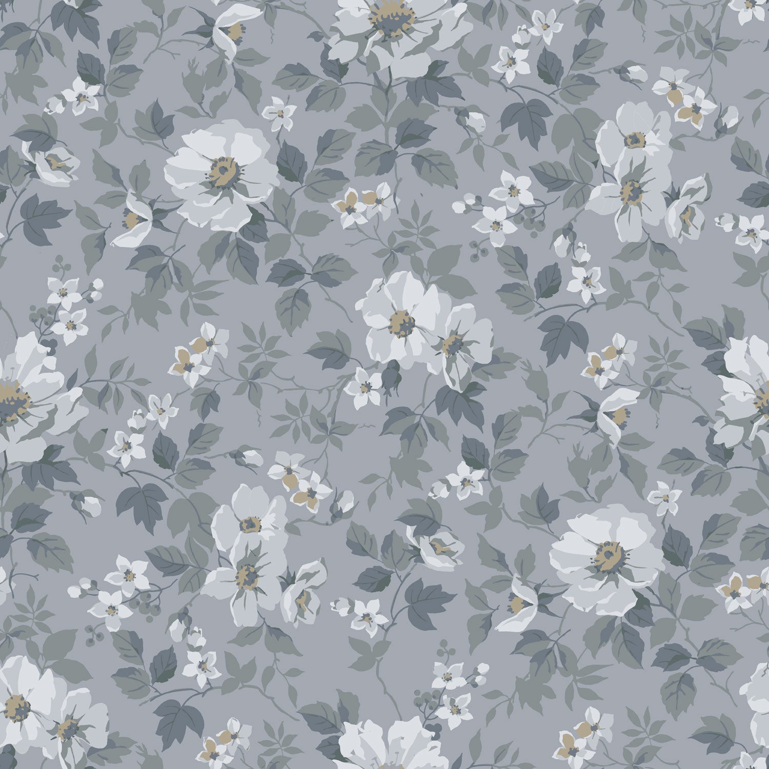 I en sval blågrå kulör skapar tapet Johanna ett behagligt rum att vistas i. En slingrande nyponros klättrar livskraftigt upp för väggarna där olika blågrå nyanser i blommor och blad harmonierar fint med bottekulören och skapar ett lugn i tapeten. Den dovt gula accentfärgen i nyponrosens mitt ger tapeten liv och är en utmärkt nyans att använda som accentfärg även på annan inredning i rummet.