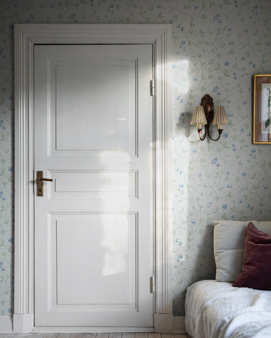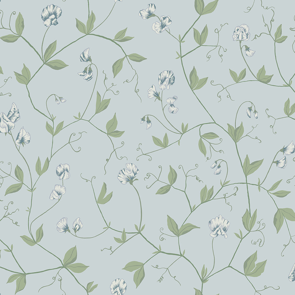 Sval ljusblå tapet med ringlande blommor i blått och vitt. Denna handmålade tapet med luktärt kommer i fyra mjuka färgställningar. Luktärten är en sann sommarklassiker, med flera anledningar än dess vackra yttre. Doften från denna blomma väcker underbara sommarminnen med dess söta doft. Låt tapeten Juliet få klättra fritt på dina väggar och sprida sin söta charm, året runt.