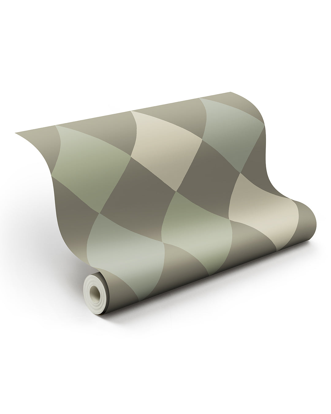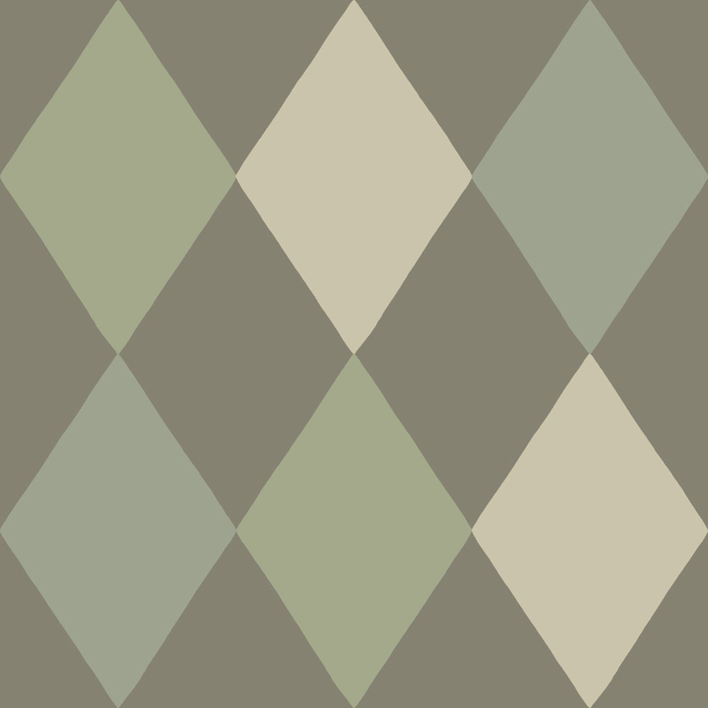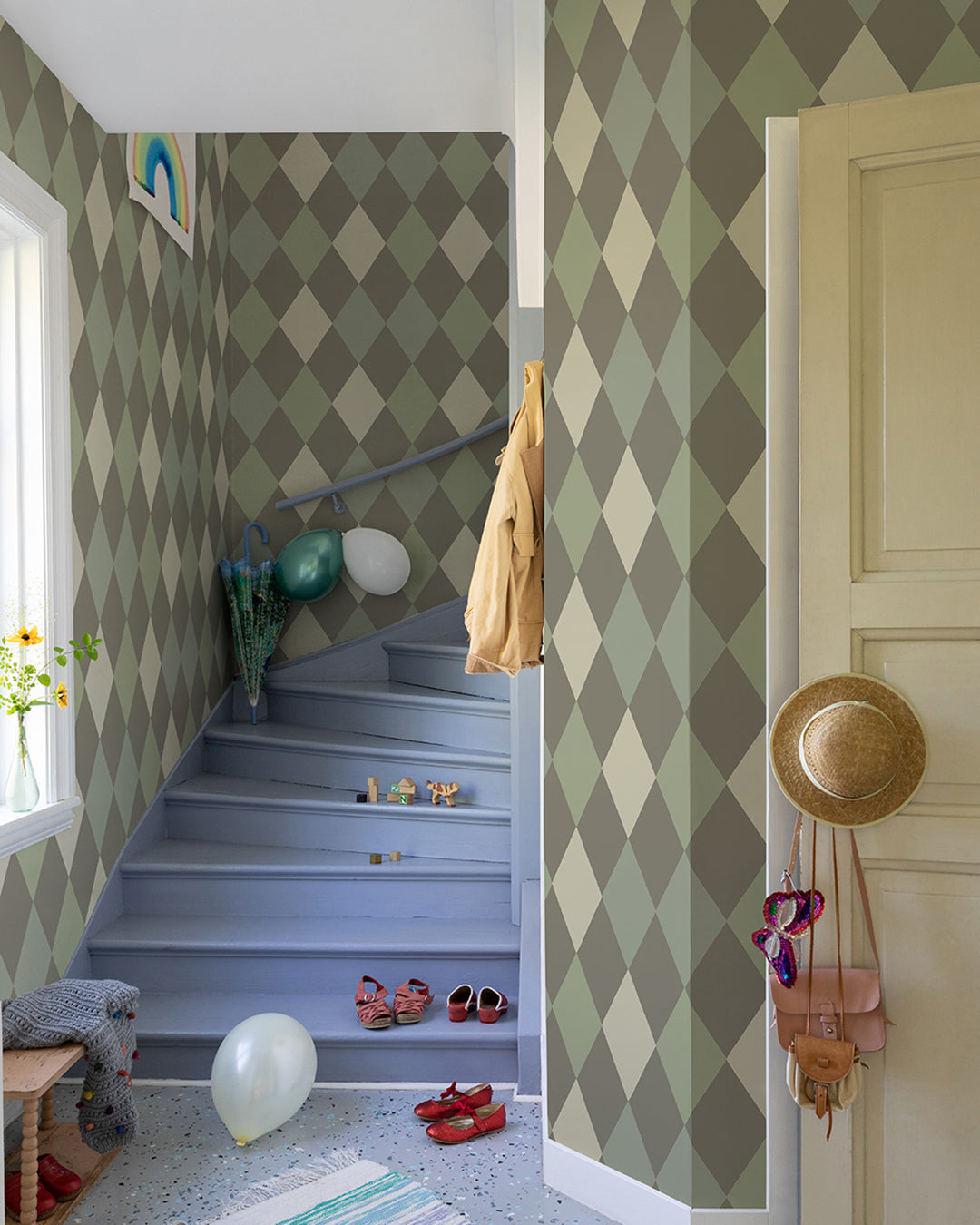 Tapet Kalas består av varsamt handritade harlequinrutor som med sina oregelbundna linjer bidrar till en mjukare känsla i tapeten. Den mörkgrå bottenkulören ger en dämpande effekt samtidigt som rutorna i grått, grönt och gråblå skapar en behaglig kontrast på väggarna.