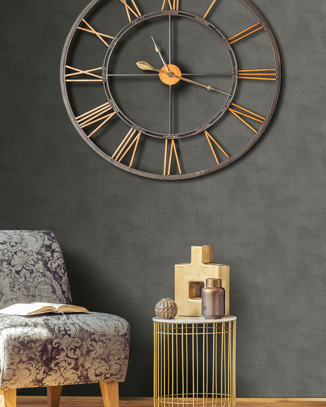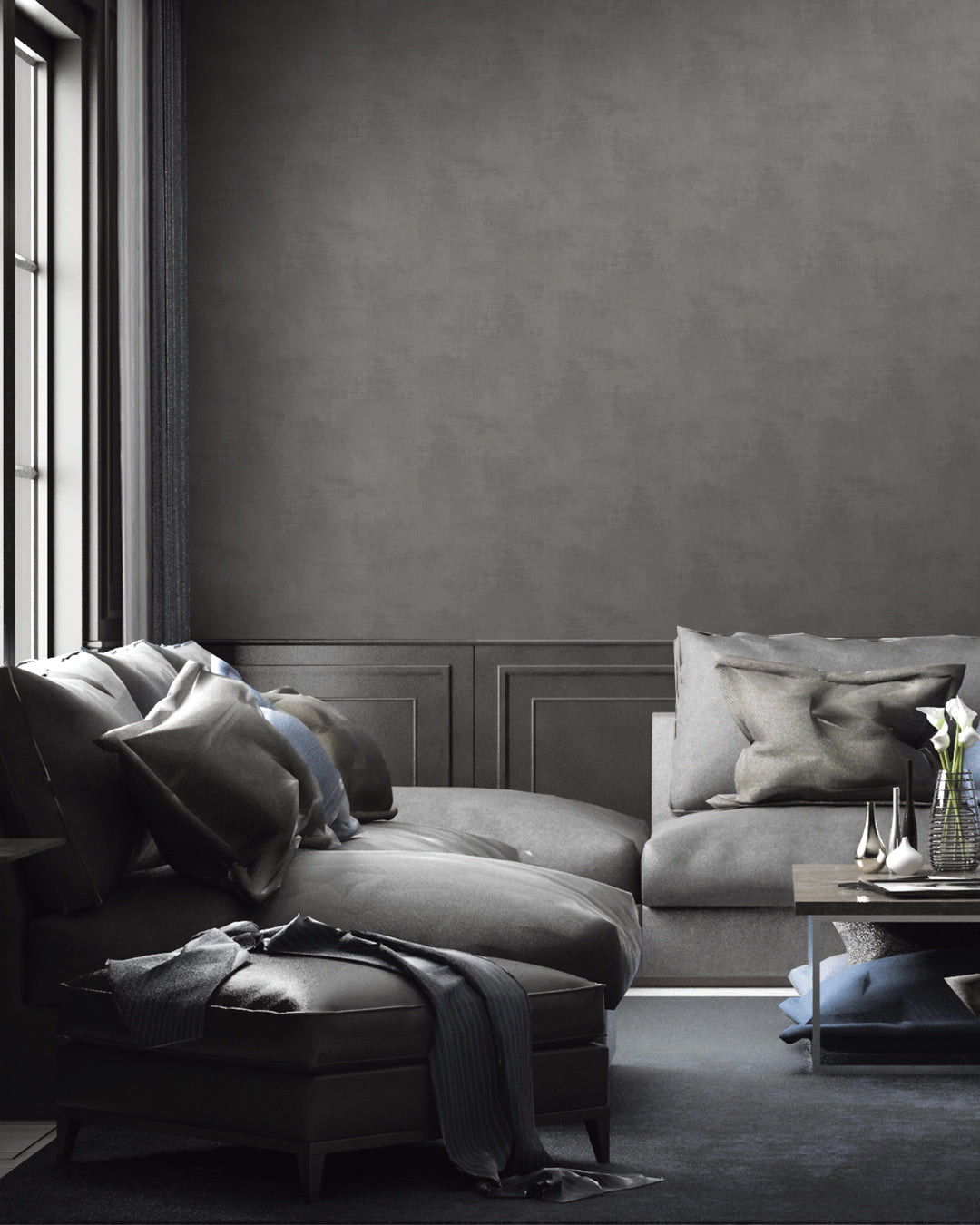 En enfärgad mörkgrå kalktapet med ett melerat mönster som ger ett djup och formar hemmet till en sofistikerad stil. Den diskreta strukturen ger väggen ett levande och effektfullt uttryck samtidigt som det skapar ett lugn. Denna kalktapeten finns i fler färger och är skapad av Björn Nilsson.