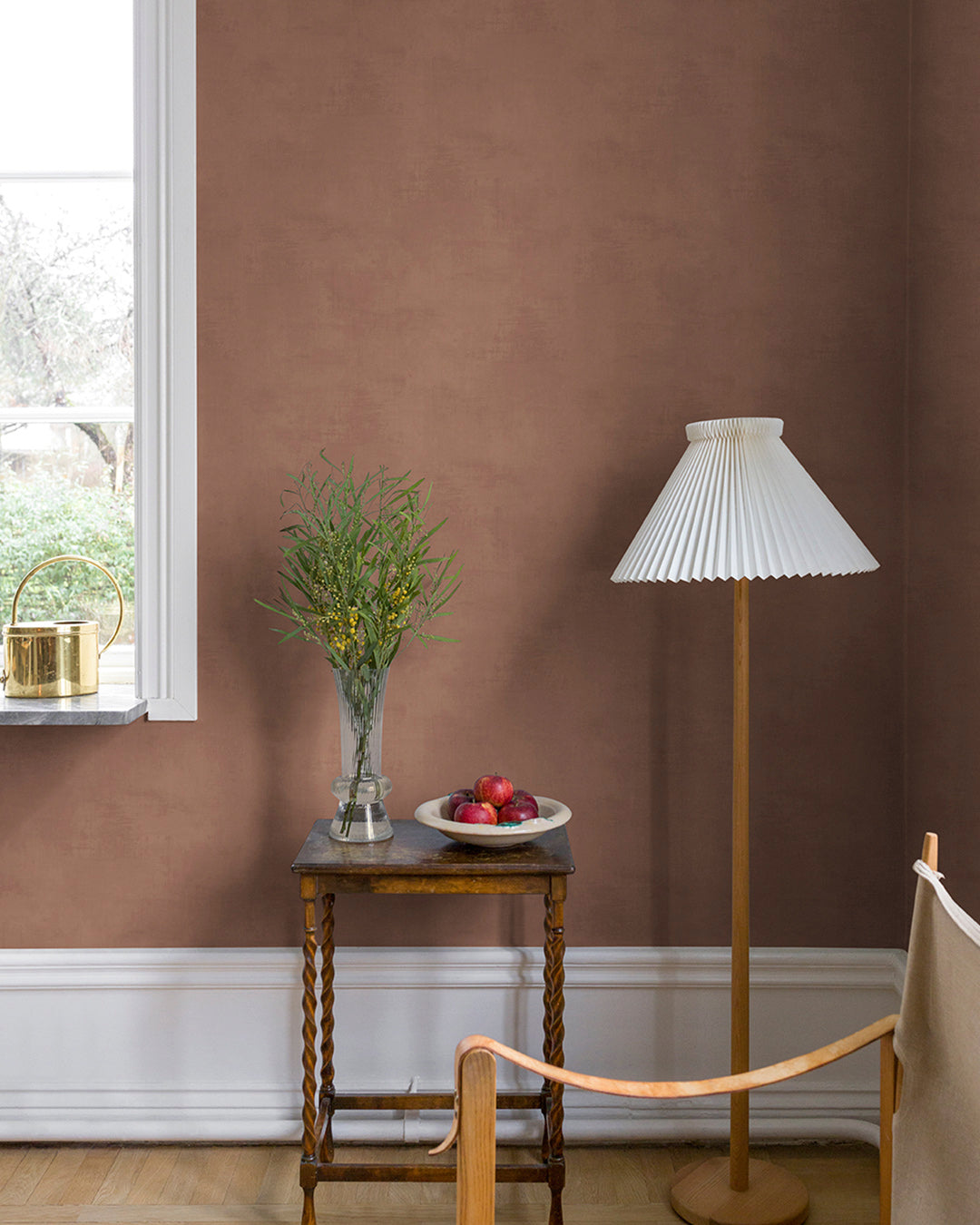 Kalktapet med en matt lätt melerad yta som går i en lätt rostig terrakottafärgad nyans. Den mjuka kulören skapar en varm, hemtrevlig och stabil känsla i rummet. Tapeten passar i hemmets alla rum. Denna tapet finns i många fler nyanser och är skapad av designern Björn Nilsson.