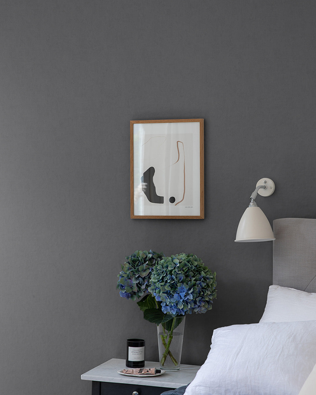Här ser du en mörk melerad tapet som påminner om en vacker åskhimmel. Tapeten är enfärgad men har ett diffust melerat mönster och lätt struktur. Strukturen gör tapeten mer levande och rummet blir genast effektfullt. Tapeten finns i många fler färger och är designad av Björn Nilsson.
