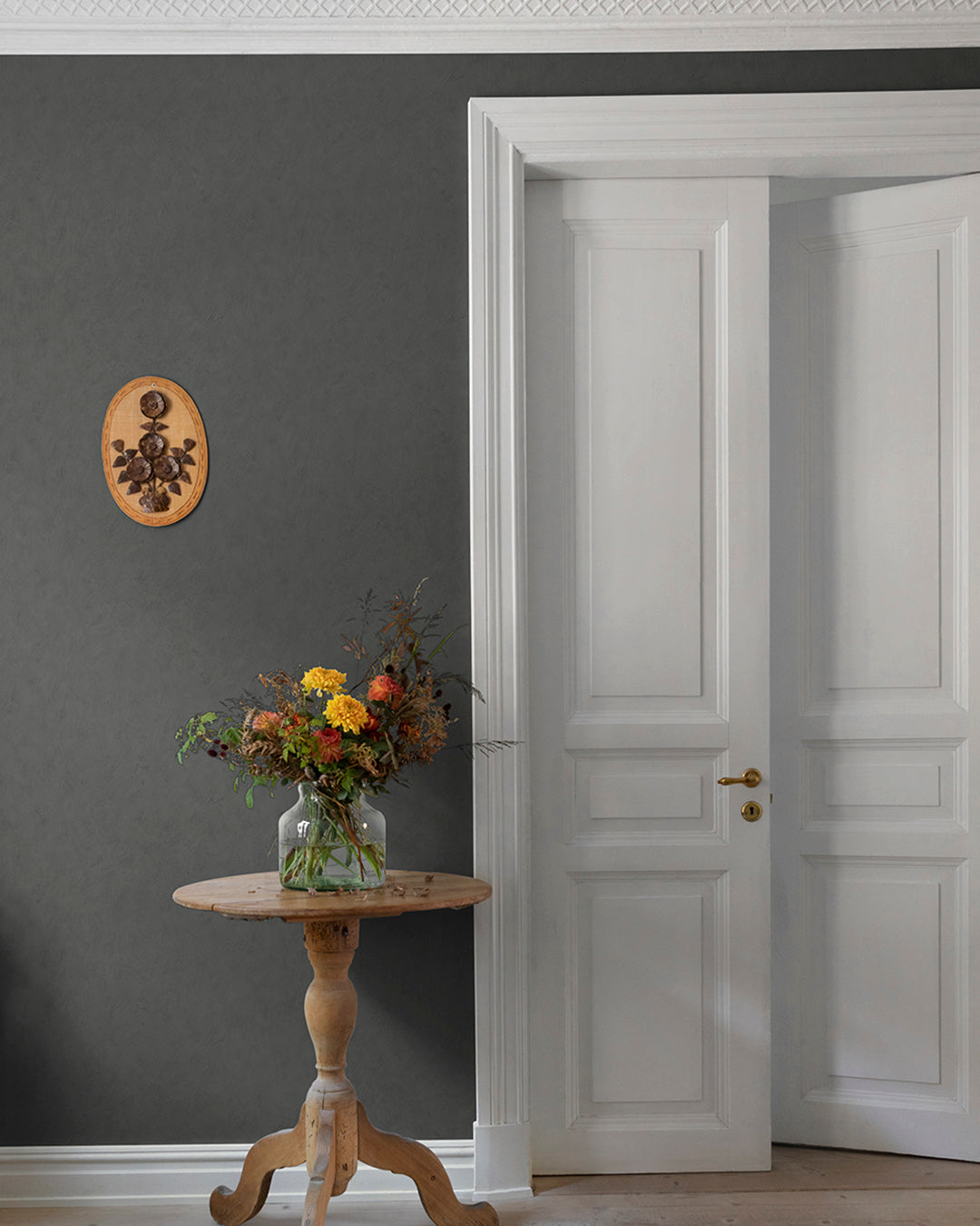 Denna gråsvarta tapeten har en mörkt kalkfärgsliknande yta som påminner om en rå betongvägg. En djärv tapet som utstrålar en oberabetad känsla, perfekt för dig som vill åt den industreilla stilen. Samtidigt ger tapeten även en touch av lyx. Tapeten är skapad av Björn Nilsson och finns i fler färgställningar.