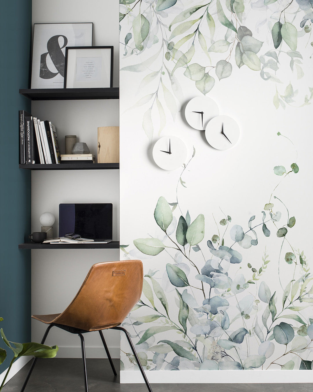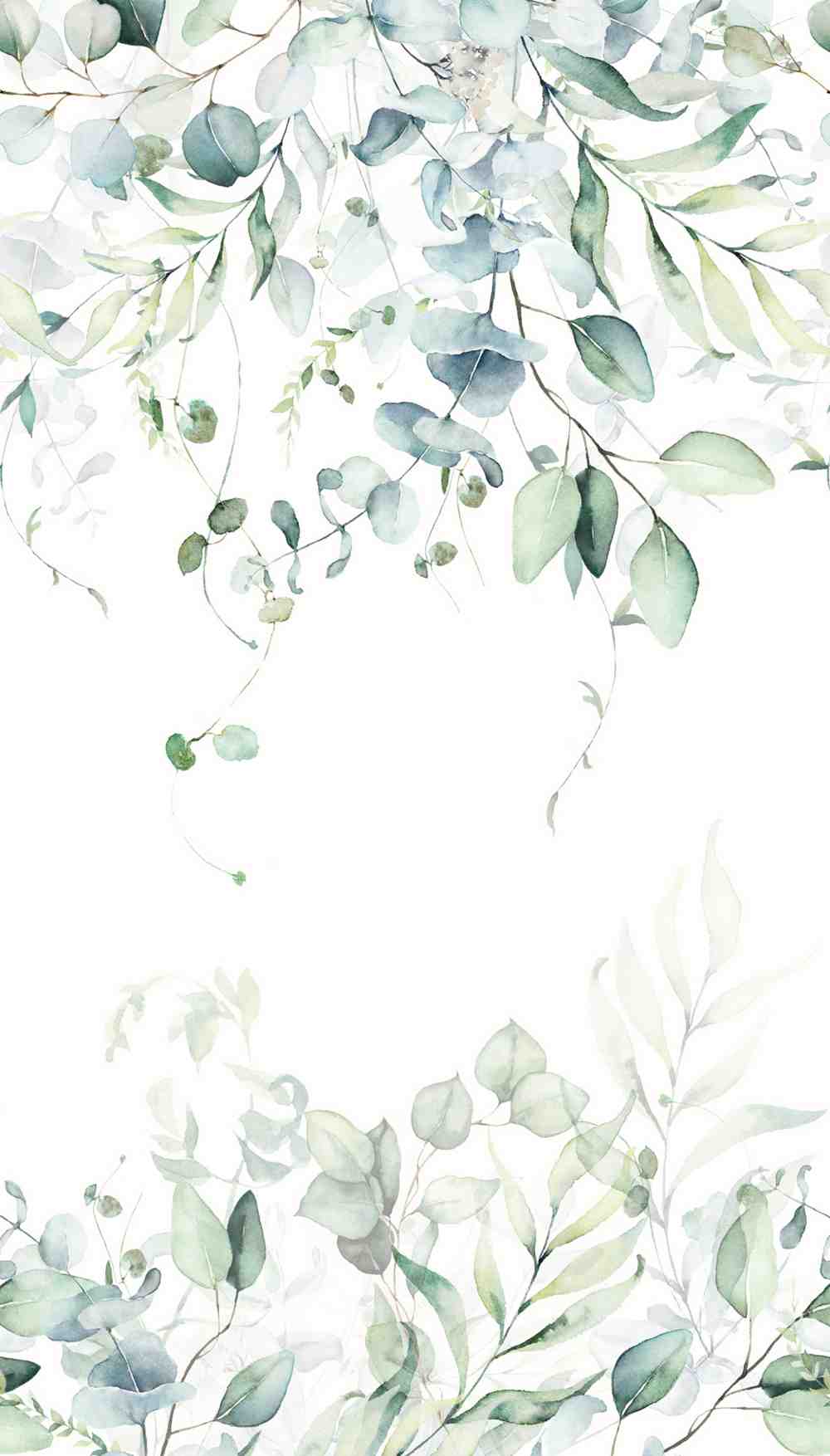 Denna eleganta fototapet bjuder in naturen på ett mjukt och harmoniskt sätt. De handmålade akvarellbladen slingrar sig över väggen i toner av dimgrönt, mild oliv och dämpat blågrått, vilket skapar en lugn och luftig känsla. Mönstret, som liknar hängande eukalyptusgrenar, ger ett naturligt och fridfullt uttryck som passar lika fint i barnrum, vardagsrum, sovrum eller hall. Fototapeten består av 3 våder med det totala måttet 159 cm (bred) x 280 cm (hög) och är repeterbar.