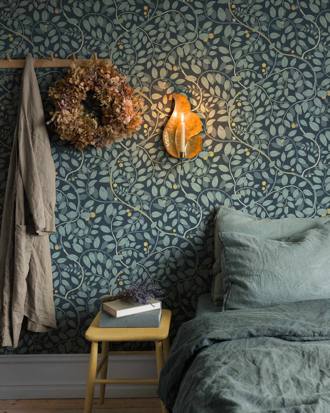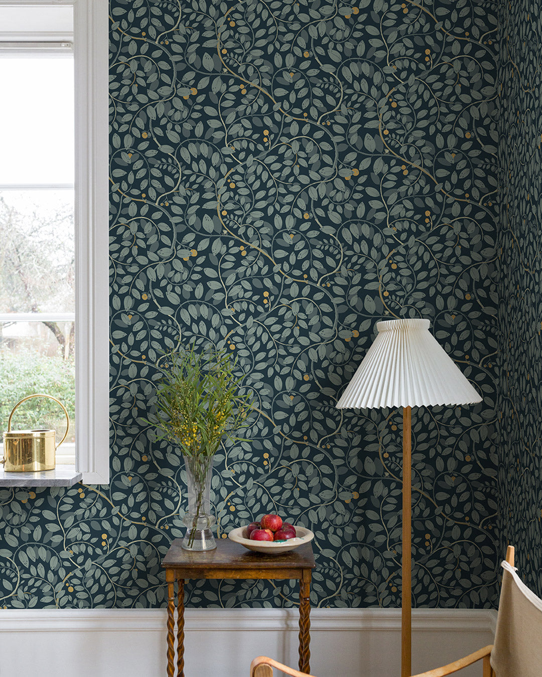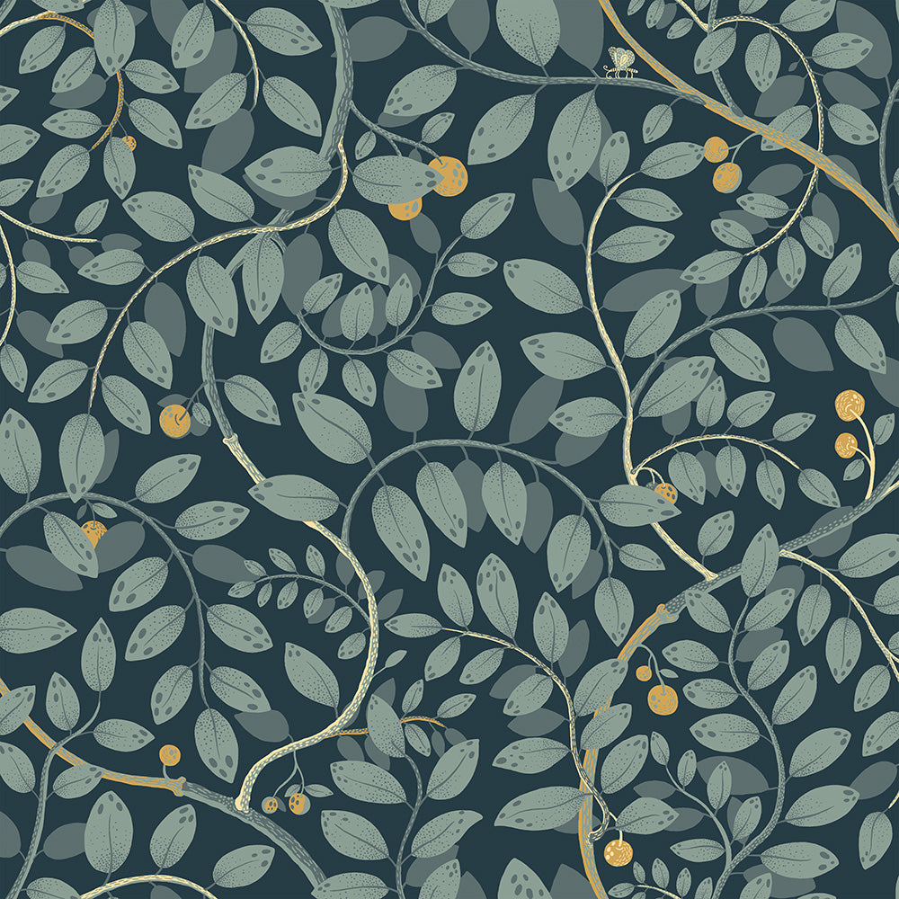 Kirke är en tapet med vackra blad och bär. Pryd tapeten i vilket rum som behagar. Med en mörkblå botten och färgskala i ljus blågrå och grått med en touch av gult ger tapeten ett djup samtidigt som den skapar ett harmoniskt uttryck. Tapeten är designad av Lina Schnaufer.