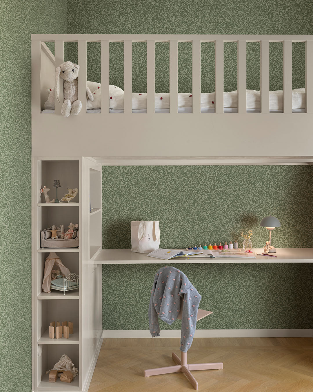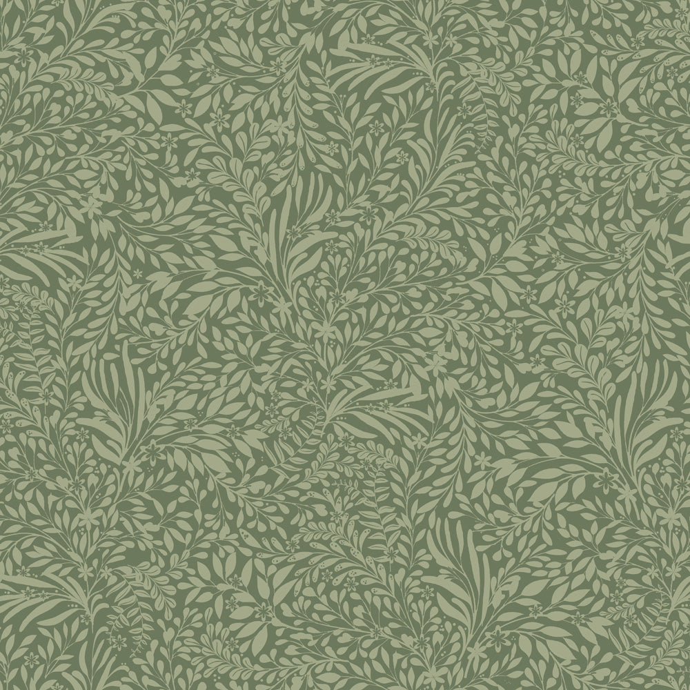 Tapet Kristina pryds av en djup och elegant grön nyans som skapar en rogivande och sofistikerad atmosfär. Det täta, slingrande bladverket smälter harmoniskt samman i toner som ligger nära varandra, vilket ger en diskret men levande struktur. De detaljerade bladen framträder mjukt mot bakgrunden och skapar ett naturligt flöde. Den mörkare färgtonen ger rummet en ombonad känsla med en tidlös och stilfull karaktär.