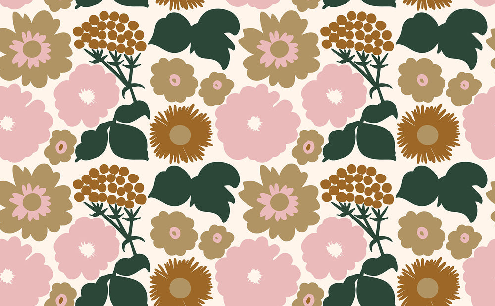 Tapet Kukkatori, som betyder blomstermarknad på finska, från Marimekko har ett livfullt blommönster i nyanser av mörkgrönt, rosa och brunt på en vit botten. Mönstret är inspirerat av ett överflöd av färgglada blommor på en sommarmarknad och har en lätt touch av retro i sitt uttryck.