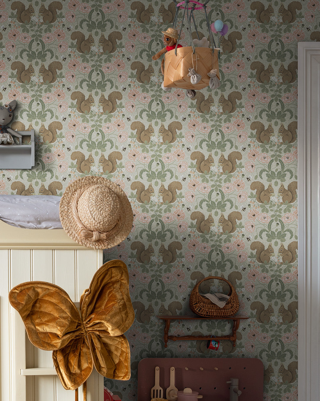 Ekorren heter Kurre och samlar på ekollon. Han gömmer dem väl och det är inte alltid som han hittar dem. Då får han kalasa på ett smultron i stället. En inbjudande och lekfull tapet som är perfekt för barnrummet. Tapeten skapar en fin balans med toner i grönt, rosa och brunt. Mönstret är ritat av Hanna Wendelbo.