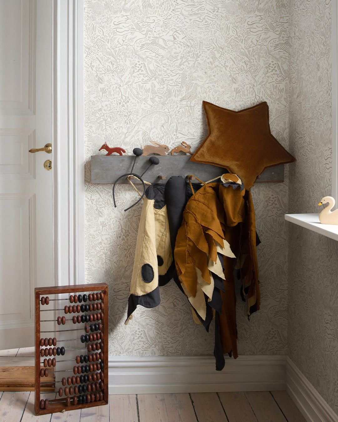 Hur många djur kan du upptäcka? I barntapeten Landskapsdjur får Sveriges djur och natur hjälpa till att skapa ett lekfullt och levande barnrum. Konturerna av söta djurkompisar i grått vilar på en äggsklasvit botten och gör rummet till en ljus och ombonad plats.
