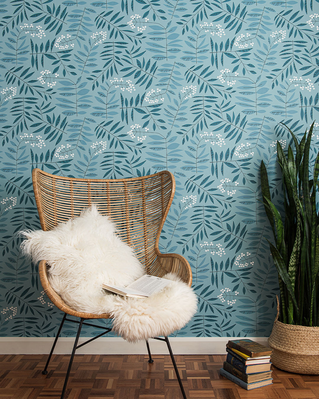 Stormönstrade tapeten Leaf Berry Winter ger en härlig touch av botanisk retro på väggarna. De olika nyanserna av turkos ger tapeten ett fint djup där det handritade mönstret med blad och bär skapar en behaglig livfullhet.