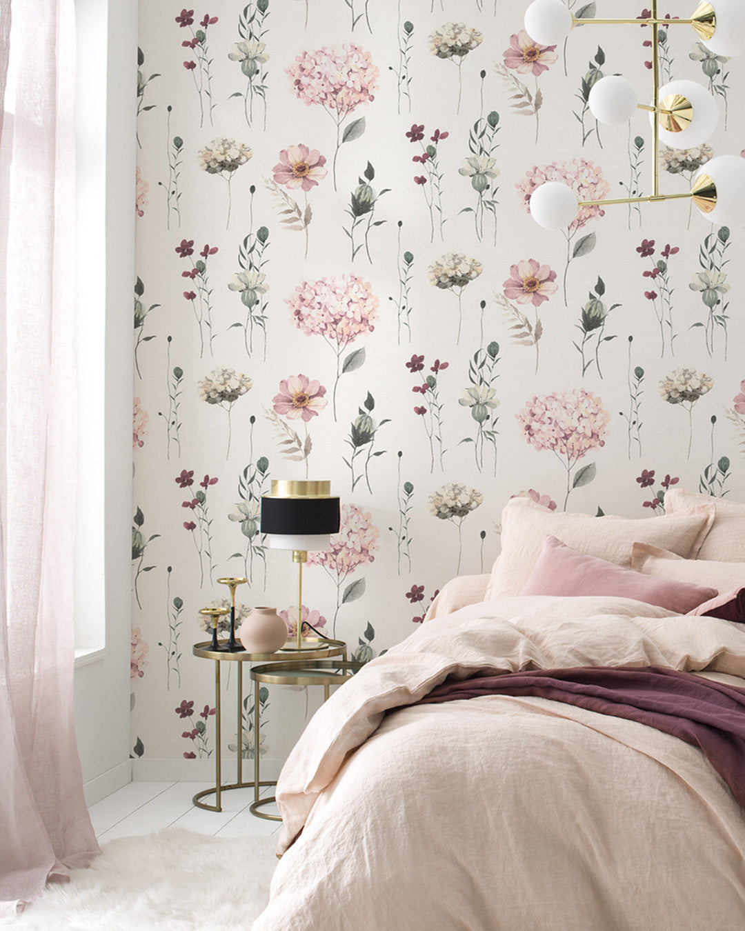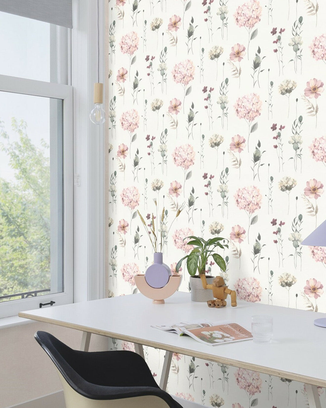 De pudriga färgerna smälter fint in på den ljusa bakgrunden. Hortensian och de andra blommorna växer sig stora och fångar snabbt betraktarens intresse. En sofistikerad och tidlös tapet för alla rum.