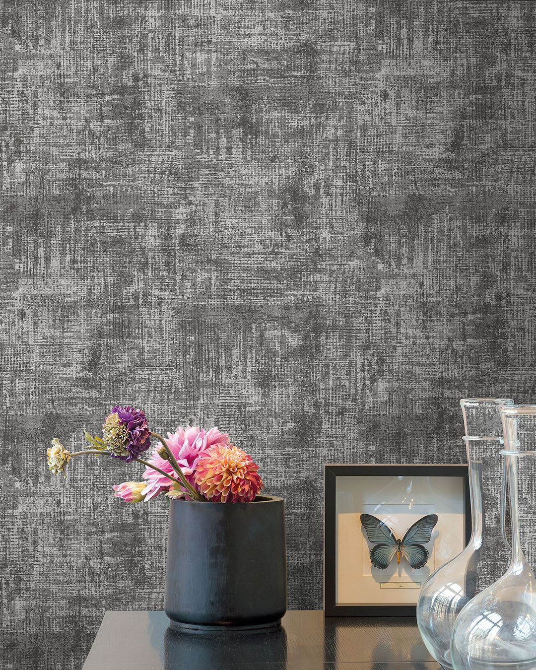 Ge rummet ett industriellt och tufft intryck med grå betongliknande tapet. Olika nyanser av grått med inslag av svart skapar en råare känsla i rummet.