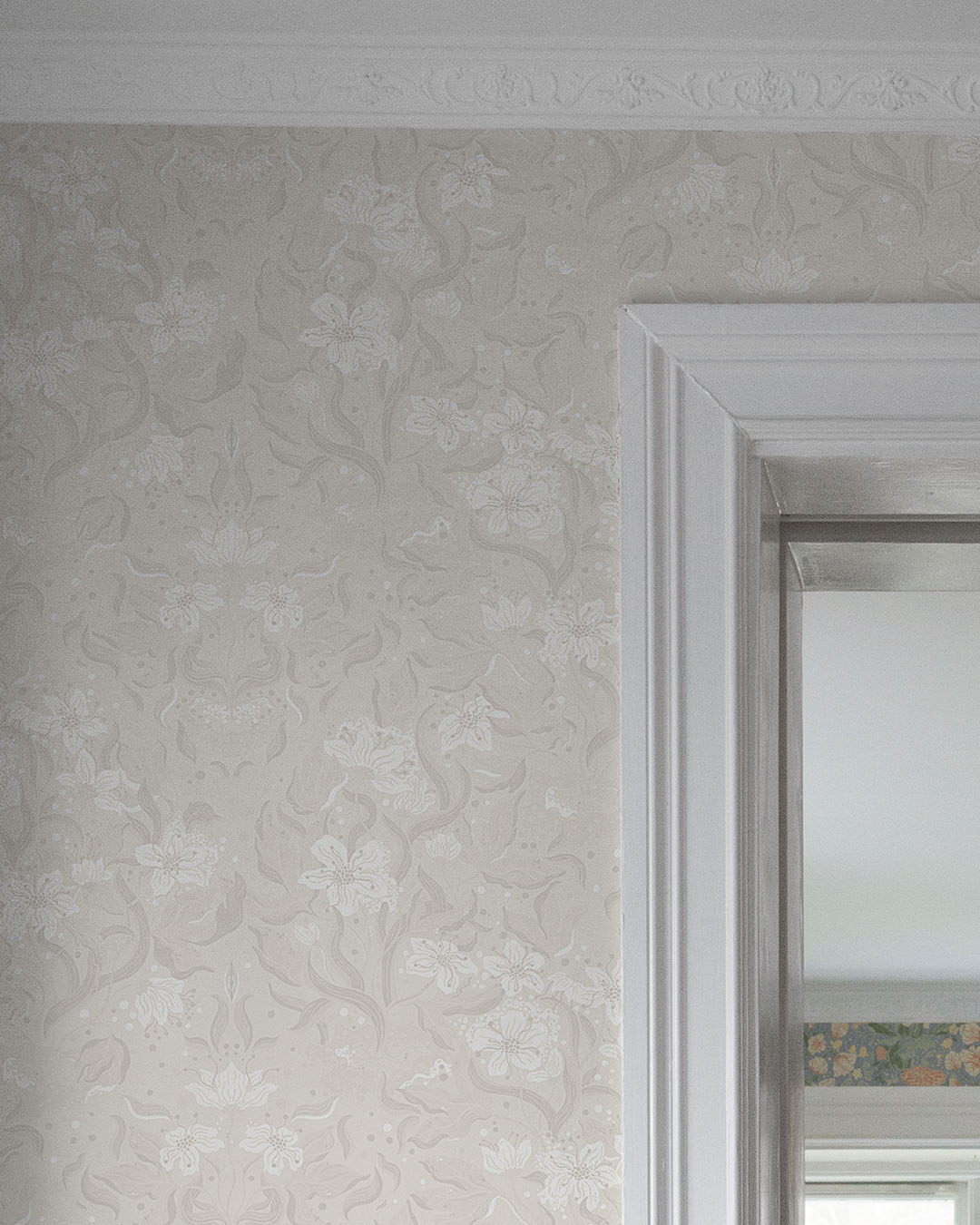 Vitsippor sprider sig i ett fantasifullt men symmetrisk mönster i tapeten Lisa. Letar du efter ett sätt att få in liv och rörelse i rummet utan att ta till med färger, då har du hittat rätt. Tapeten sprider ett varmt lugn och ger utrymme får återhämtning med sitt beige och vita mönster mot en neutral botten. Klä ditt kök eller kanske sovrummet i Lisa för ett milt och inbjudande intryck.