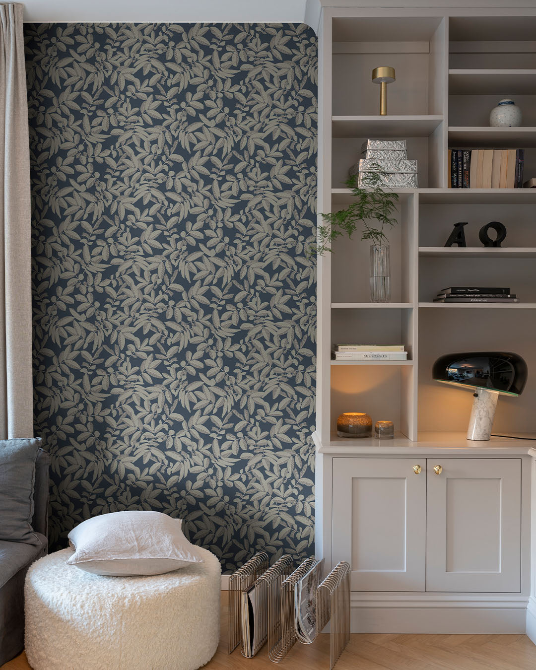 Tapet Lövskog utstrålar en sofistikerad och rogivande känsla med sin djupa mörkblå bottenkulör och ett elegant bladverk i mjuka grå nyanser. De detaljerade bladen breder ut sig över ytan i ett dynamiskt men harmoniskt mönster, som för tankarna till en stilla skog i skymningsljus. Den kontrasterande färgsättningen skapar en subtil men effektfull dramatik, perfekt för att ge rummet en känsla av lugn, djup och tidlös elegans.