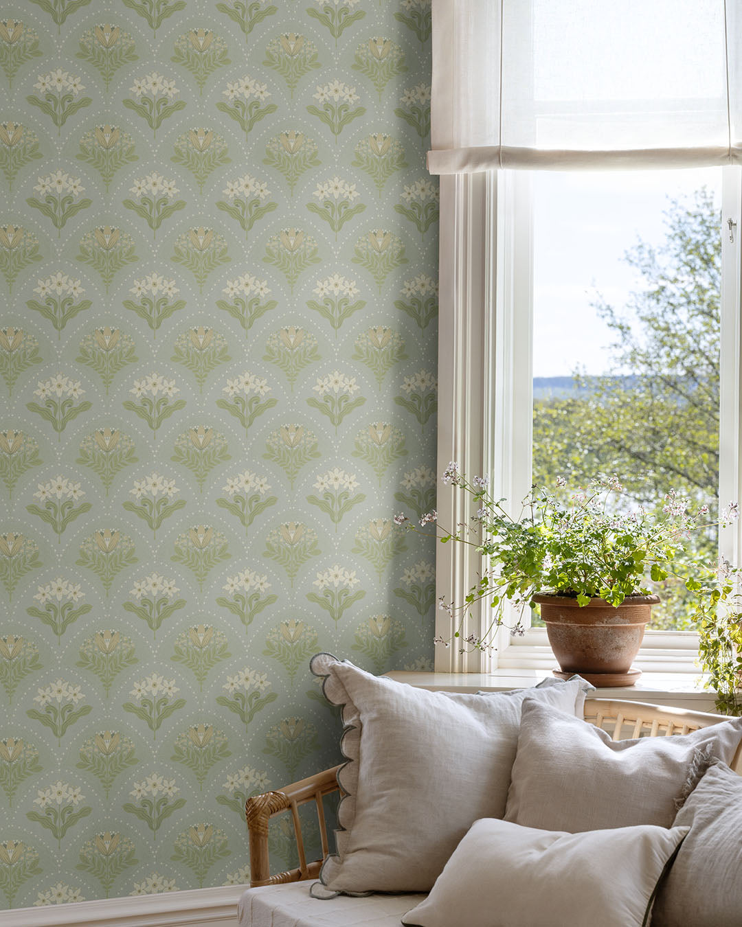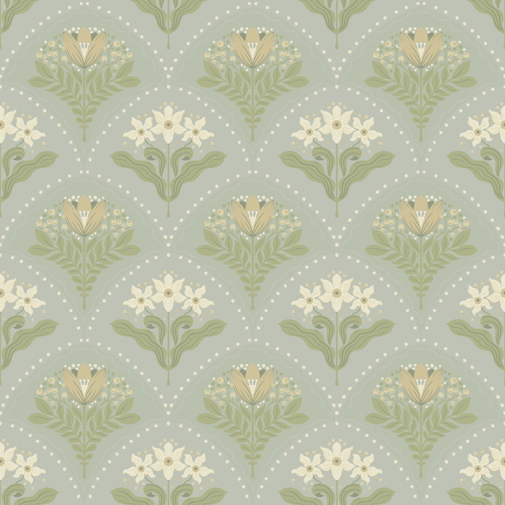 Tapeten Maj bjuder på sommarblommor och söta blåbär, en doft av sommar som dröjer sig kvar länge. I denna tapet möts bågformade fält i ljusblått och ljusgrönt som pryds av blommor och blåbär i nyanser av grönt, vitt och beige. Tapeten bidrar med en lättsam känsla likt en nätt spetsgardin som mjukt rör sig i vinden.