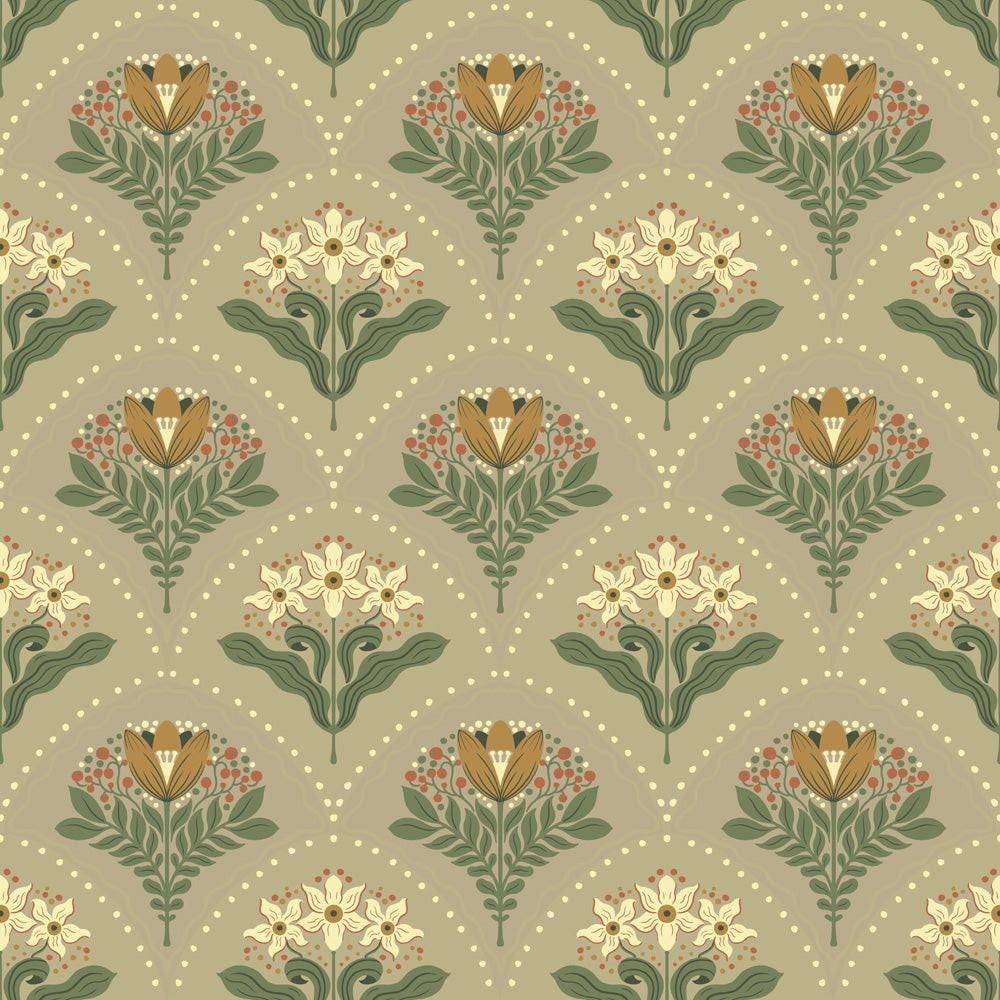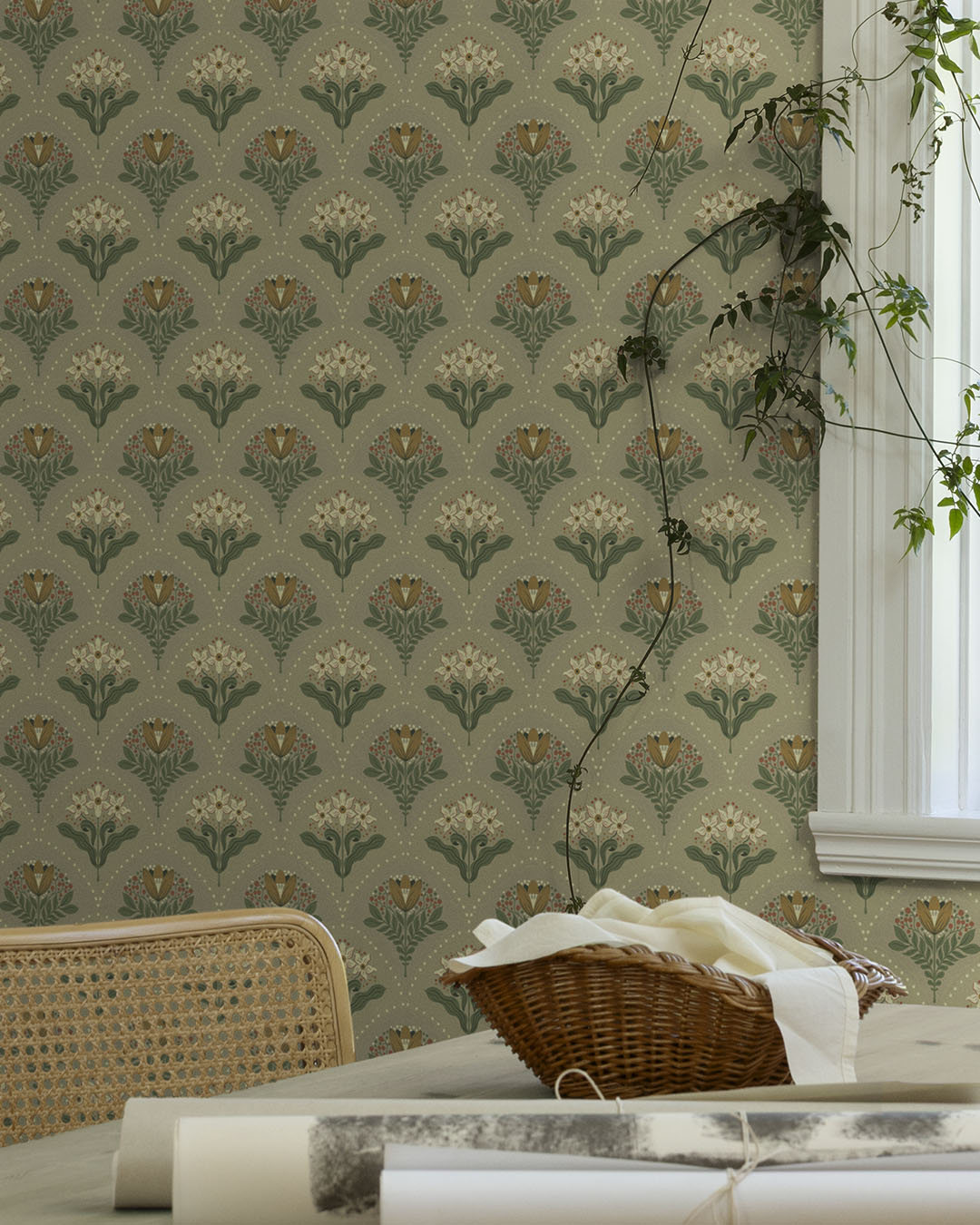 Tapeten Maj blir ett ombonat och dekorativt inslag i rummet i denna något mustiga färgställning. Sommarblommor och blåbär i grönt, rött, creme och terrakotta omges av bågformade fält i greige nyans. Små ljusa punkter ramar fint in varje fält och blomma och dessa tillsammans påminner tapetens mönster om ett gammaldags spetstyg.