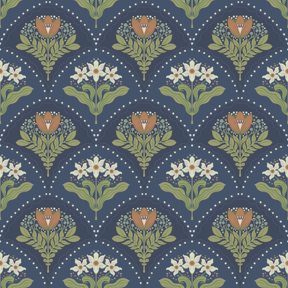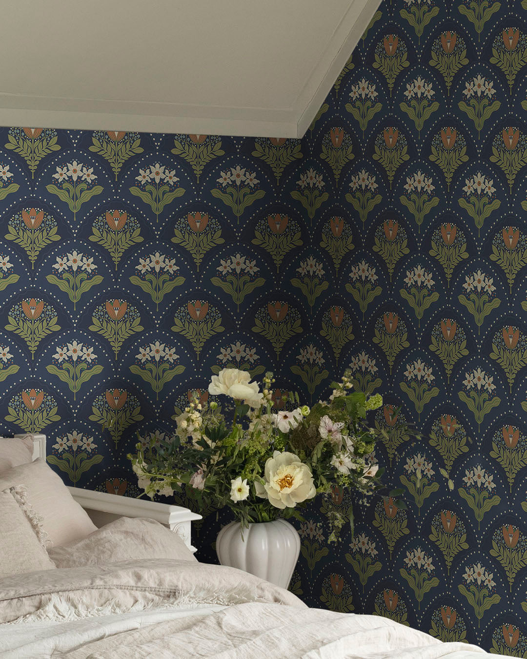 På en mörkblå botten med sommarblommor och blåbär i nyanser av grönt, blått, vitt och terrakotta får tapet Maj ett praktfullt uttryck som ger rummet ett trivsamt djup. Njut av tapetens dekorativa mönster som låter doften av sommar stanna kvar innanför hemmets väggar. Med tapeten Maj sätter du en personlig prägel på ditt hem.