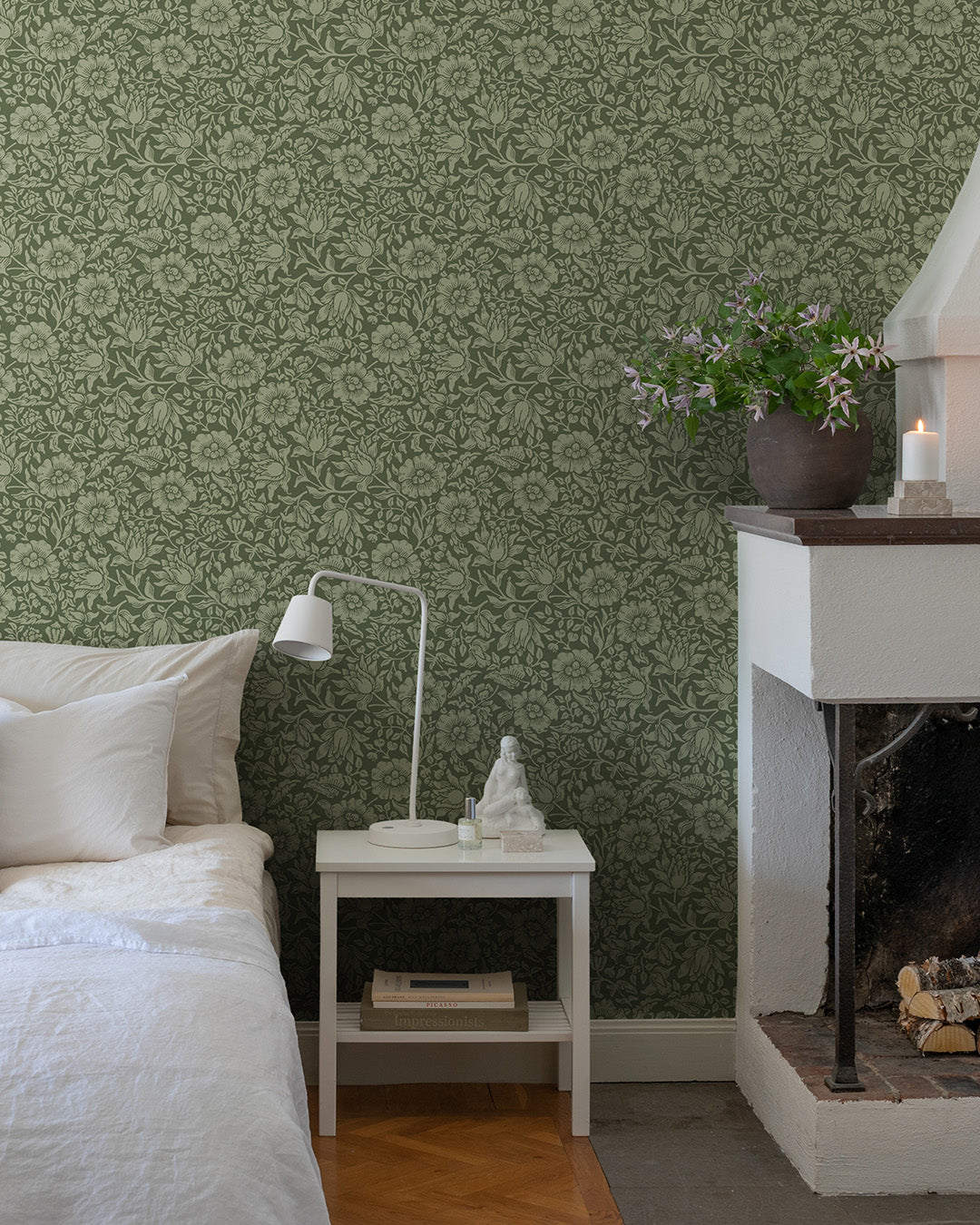 Tapeten Mallow förtrollar och fascinerar. Med sin enkelhet men detaljrikedom tillför den en vacker elegans i hemmet. Skapat av William Morris redan på 1800-talet men andas tidlöshet vilket blir tydligt när det får ta plats i våra hem idag. Den fina Malvablomman i ljusare grönt förgrenar sig över den mörkgröna botten.