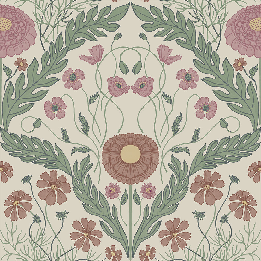 "Ja, det va en kväll i juni, då när sommaren är som allra bäst." Tapeten Marquerite står för sommar och sjunger ut en vacker sommarmelodi i hela hemmet. Tapeten medför en härlig känsla och du blir varm i hela kroppen. Med underbara glada nyanser i grönt och rosa omvandlas rummet till ett somrigt paradis.