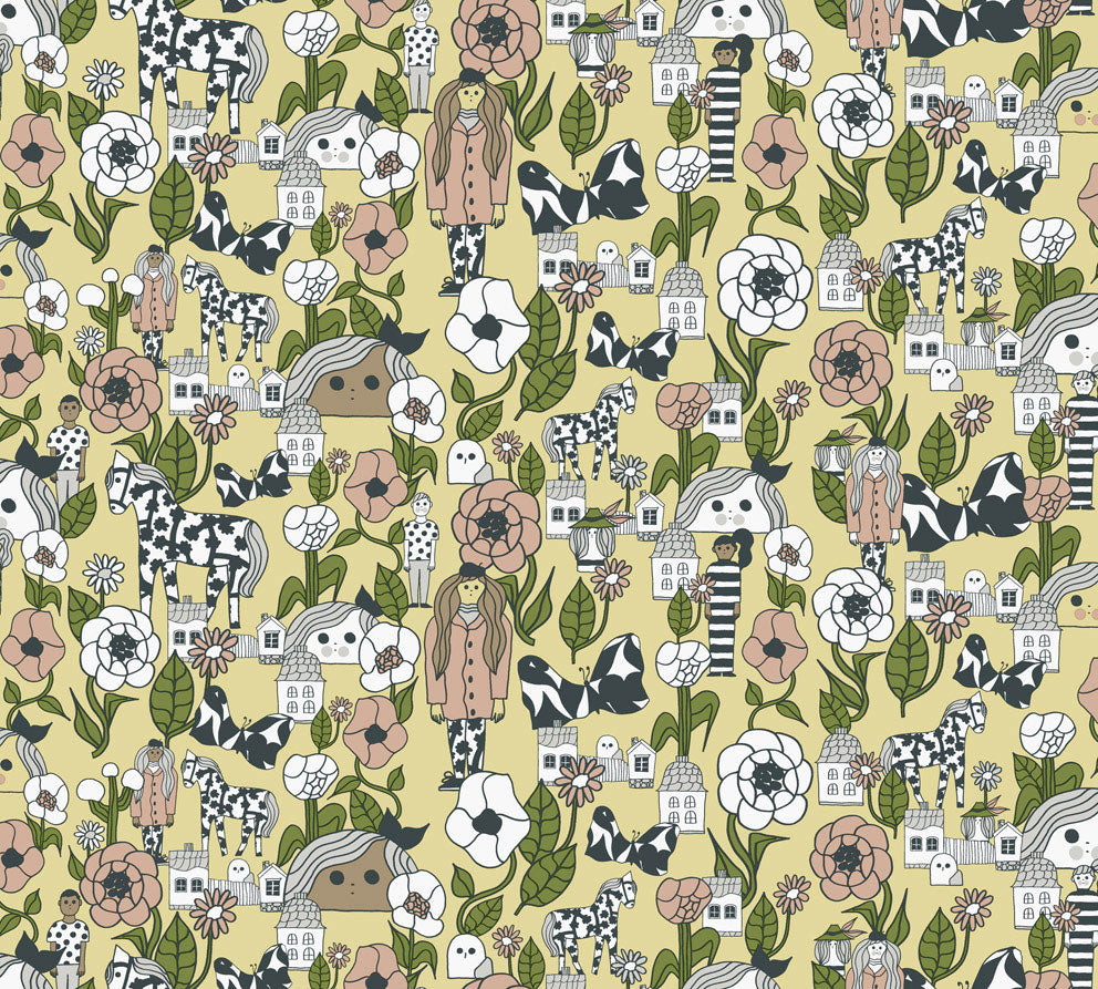 En gul tapet möts av behagliga färgkombinationer i form av en dämpad rosa, frodig skogsgrön samt gråa och vita figurer. Tapeten utstrålar glädje och livfullhet med dess alla detaljer blir den en utmärkt fondvägg likaväl i barnrummet som i resten av hemmets rum.