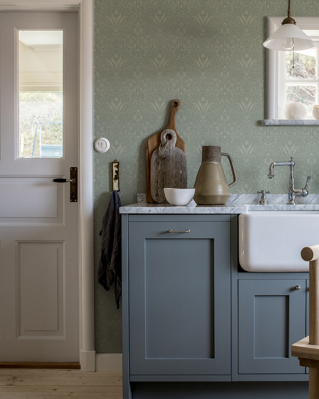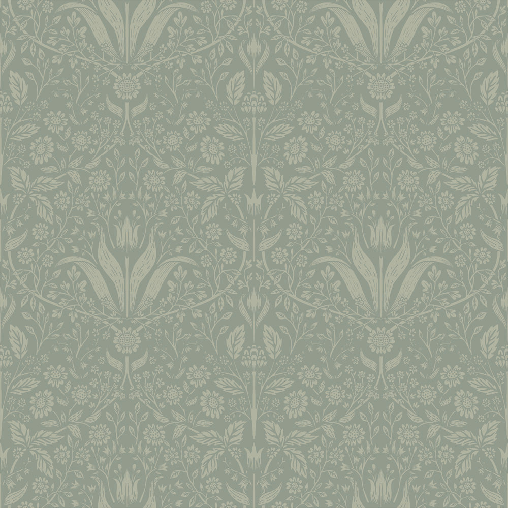 Mary är en klassiskt och tidlös tapet vars mönster har en lugnande effekt på våra sinnen. Den harmoniskt grågröna botten prydes av ljust gröna tulpaner och små ängsblommor med snirkliga blad. Tapeten har ett behagligt uttryck som passar utmärkt i hemmets alla rum.