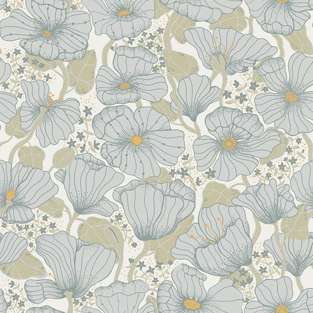 Härliga vallmo tapeten Matilda är en enda stor blomsterdröm! Skapad av designern Lina Schnaufer. Den blå blomman har en sval och uppiggande effekt som skapar liv! Mjuka och dova nyanser gör att denna blommiga tapet passar perfekt till sovrummet men likaväl som till vardagsrummet eller hallen.