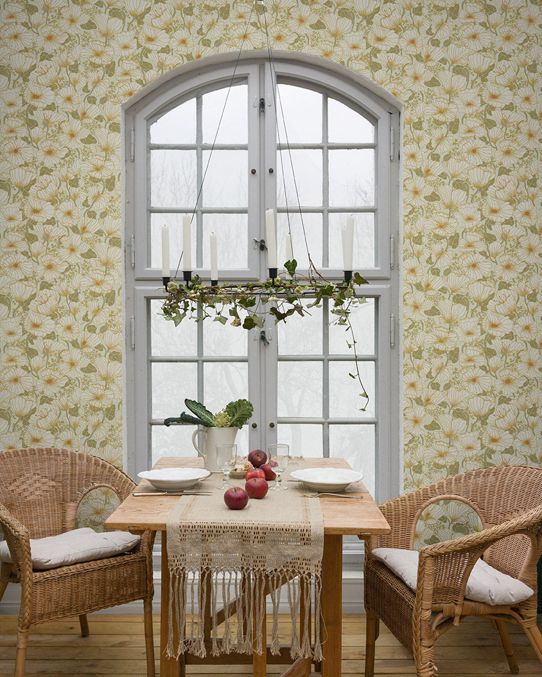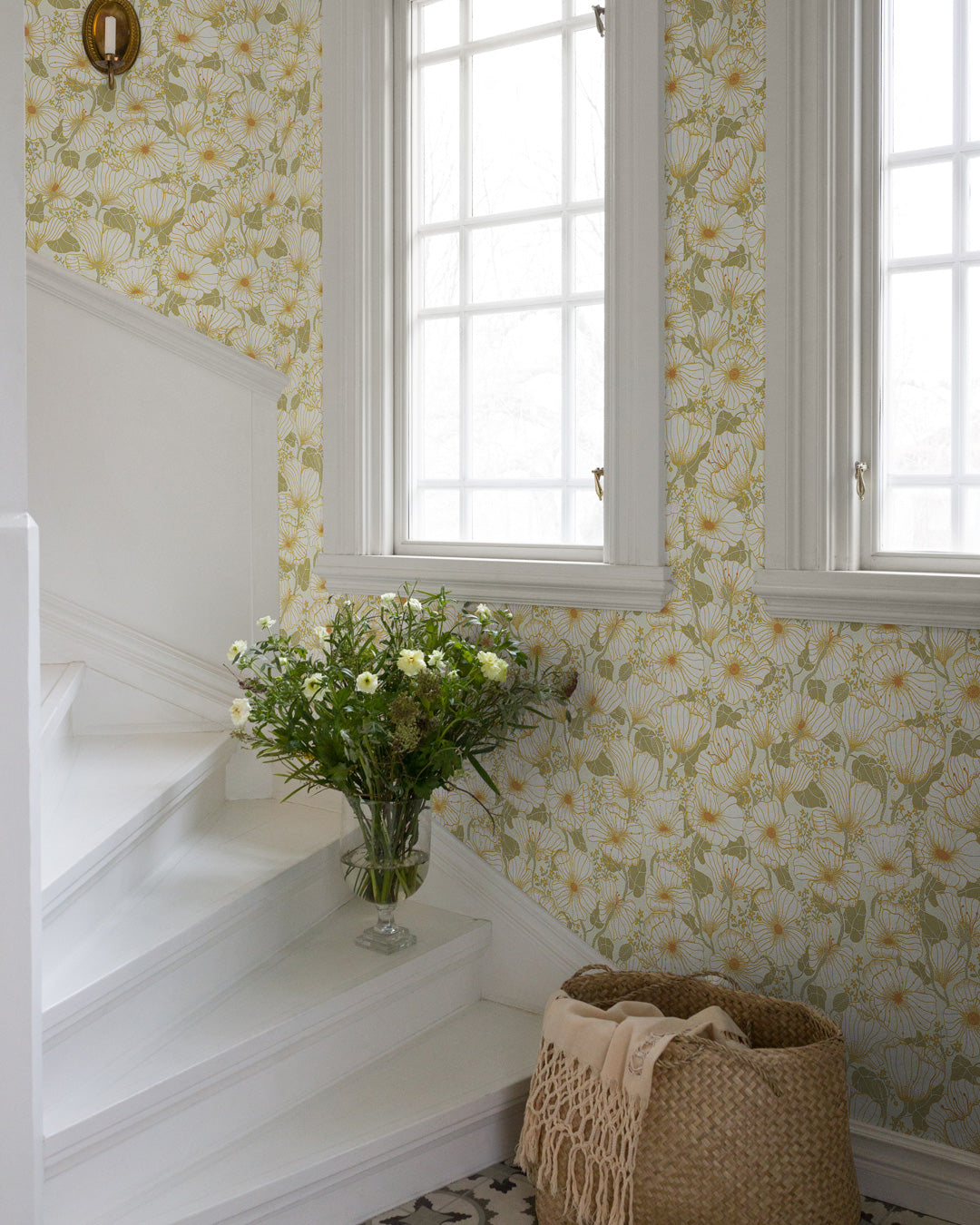 Tapeten Matilda sprudlar av vackra stora vallmoblommor och för tankarna till en böljande sommaräng. De gula stora blommorna likt en sol, sprudlar av värme och energi. Den något kalla botten gör att tapeten får en fin balans. Med Matilda har du sommarkänslor året om. Skapad av Lina Schnaufer.