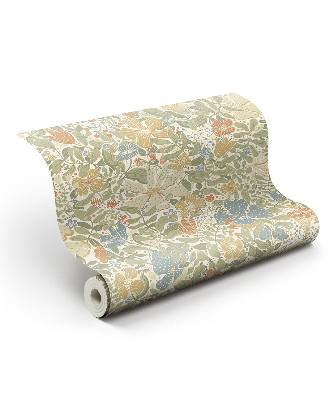 I mönstret Midsommar värmer solen på myggbitna ben. En baddräkt korvar sig längs axlarna på väg ner mot vattnet. Sommarlov och sommarlugn. Midsommar är ett heltäckande mönster som trivs i alla typer av rum som vill ha en dos sommar året runt. Med den dova färgställningen av blågrå, rost, grönt och havre ger tapeten en behaglig och välkomnande känsla i rummet.