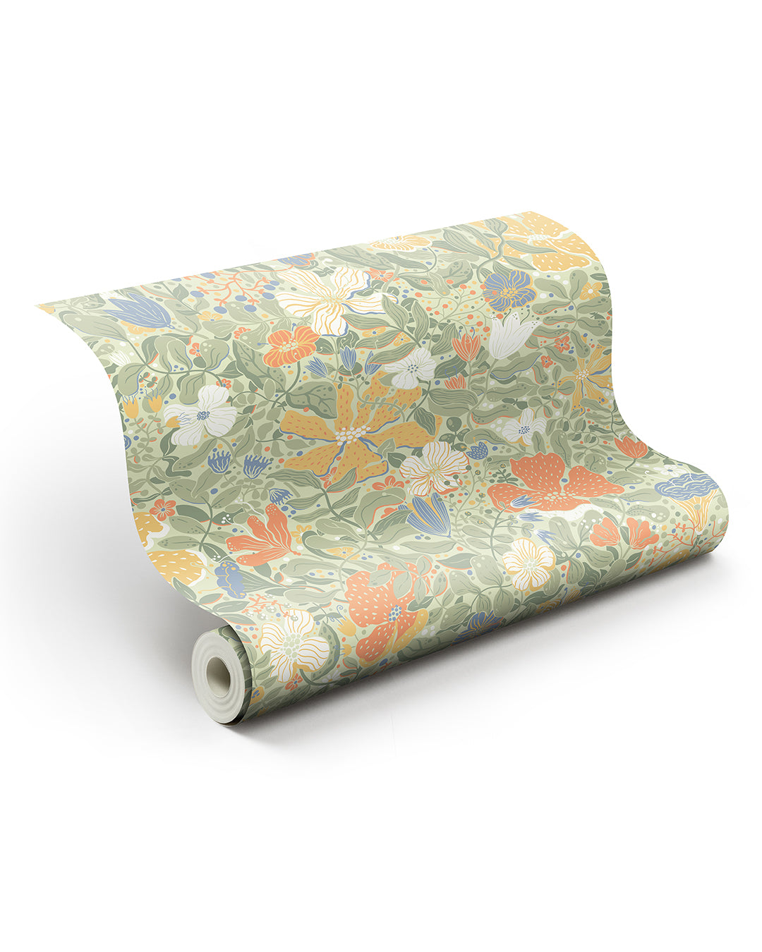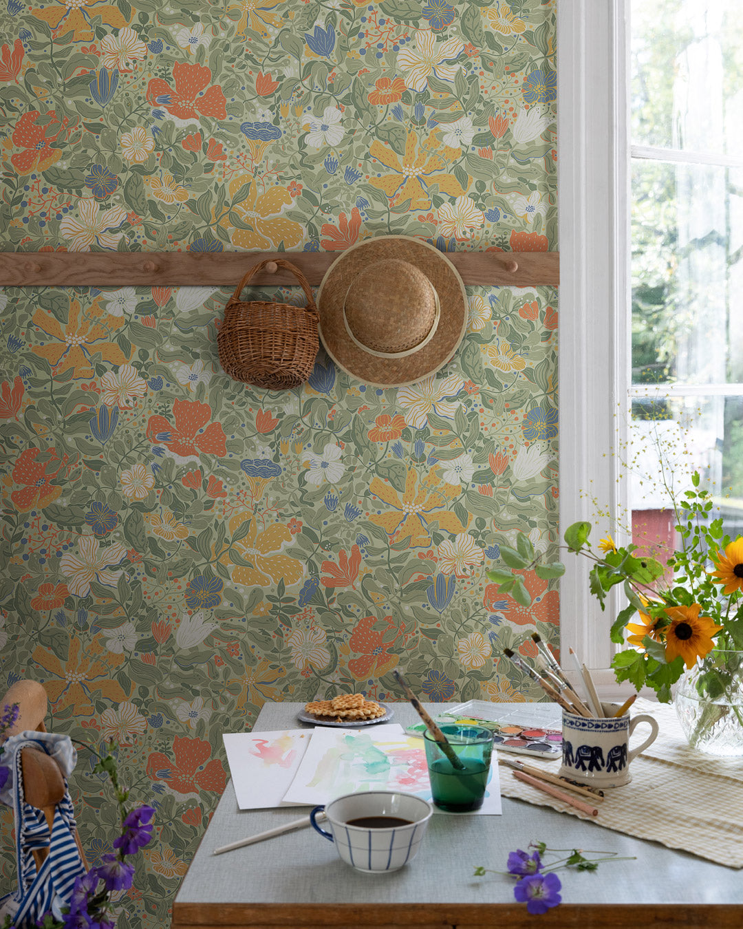 Tapet Midsommar i ljusgrön färgställning ger dig härliga vårkänslor. Klara kulörer som gult, blått och hallonrött ger tapeten ett piggt och glatt uttryck. En blommig tapet som sprider glädje i hemmet årets alla dagar och kanske speciellt när solens varma strålar inte når hela vägen in.