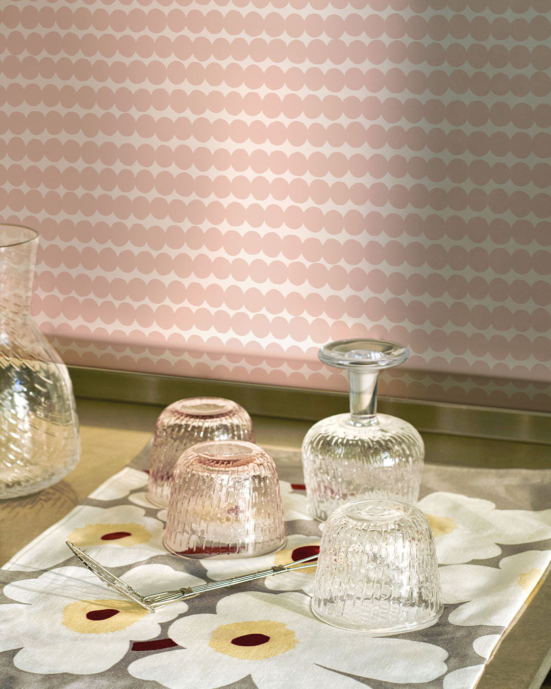 Tapet Räsymatto i mjuk rosa och ljusgrått från Marimekko är en finstämd tolkning av ett ikoniskt mönster där det grafiska möter det poetiska. Cirklarna, som löper i rytmiska rader, känns nästan som penseldrag organiska, levande och samtidigt återhållsamma. I denna färgkombination tar tapeten ett varsamt och drömskt uttryck. Den dova rosa nyansen för in en känsla av värme och ömhet, medan det ljusgrå adderar balans och stillhet. Tillsammans skapar de en harmonisk yta som är både modern och romantisk, utan att bli söt.