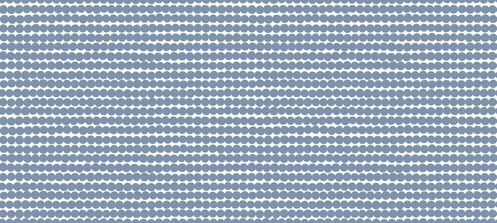 Tapet Räsymatto i gråblått och vitt är en stillsam och luftig tolkning av Marimekkos klassiska mönster. De runda formerna radas upp i ett enkelt, men levande mönster, inspirerat av vardagliga textilier och handens arbete. I den här färgsättningen möts svalt gråblå och krispigt vitt i en subtil kontrast som ger rummet ett lugnt och friskt uttryck. Den gråblå tonen påminner om disiga morgnar eller skymningsljus sval men aldrig kall medan vitt ger lätthet och andrum. Det är en tapet som ger väggen ett behagligt djup utan att ta över rummet.