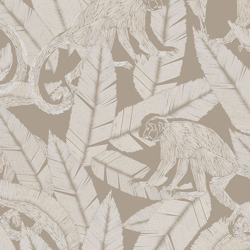 Tropiska mönster behöver inte nödvändigtvis vara färgbomber med små som stora detaljer. Denna tropiska design går i de skandinaviska och minimalistiska fotspåren med raka linjer och jordnära toner. Beige tapet med ett motiv fyllt av vita och guldiga apor och blad.