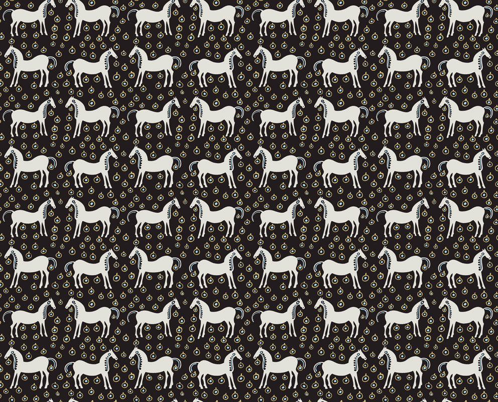 Marimekkos mönster Musta tamma (svart sto) speglar designern Maija Isolas minnen av sin barndom, då hon ofta föreställde sig att hon sprang fritt i skogen tillsammans med en stor flock hästar. I denna färgställningen ser vi en svart tapet med ljusgråa siluetter i form av hästar som omringas av handritade cirkulära former.