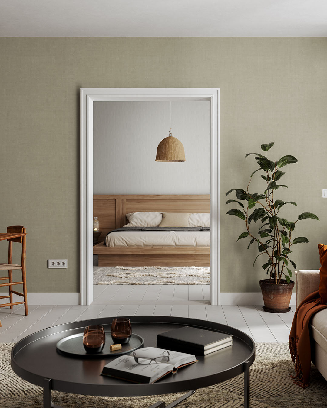 Enfärgade tapeten Jute i en neutral brun nyans har en taktil textil-liknande yta som skapar en diskret livfullhet i hemmet. Kombineras fint med mönstrade tapeter.