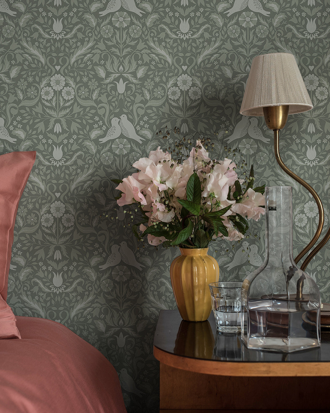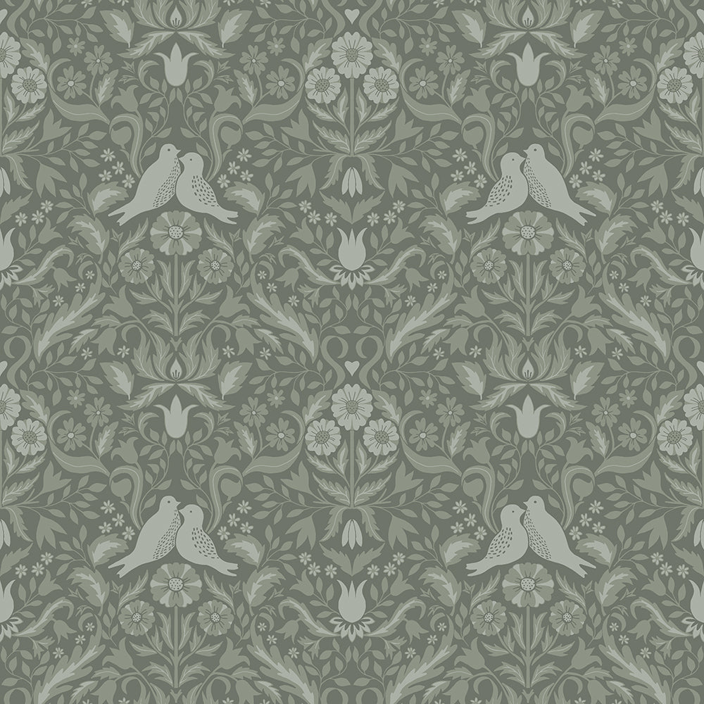 Här samsas blommor och fåglar i gröna mönstret Niki för att skapa ett karaktäristiskt uttryck i rummet där de tapetseras. Denna dämpade gröna fågeltapet andas elegans samtidigt som den skapar en avslappnad känsla i rummet. Denna designtapet passar till sovrum, kök, vardagsrum och barnrum.