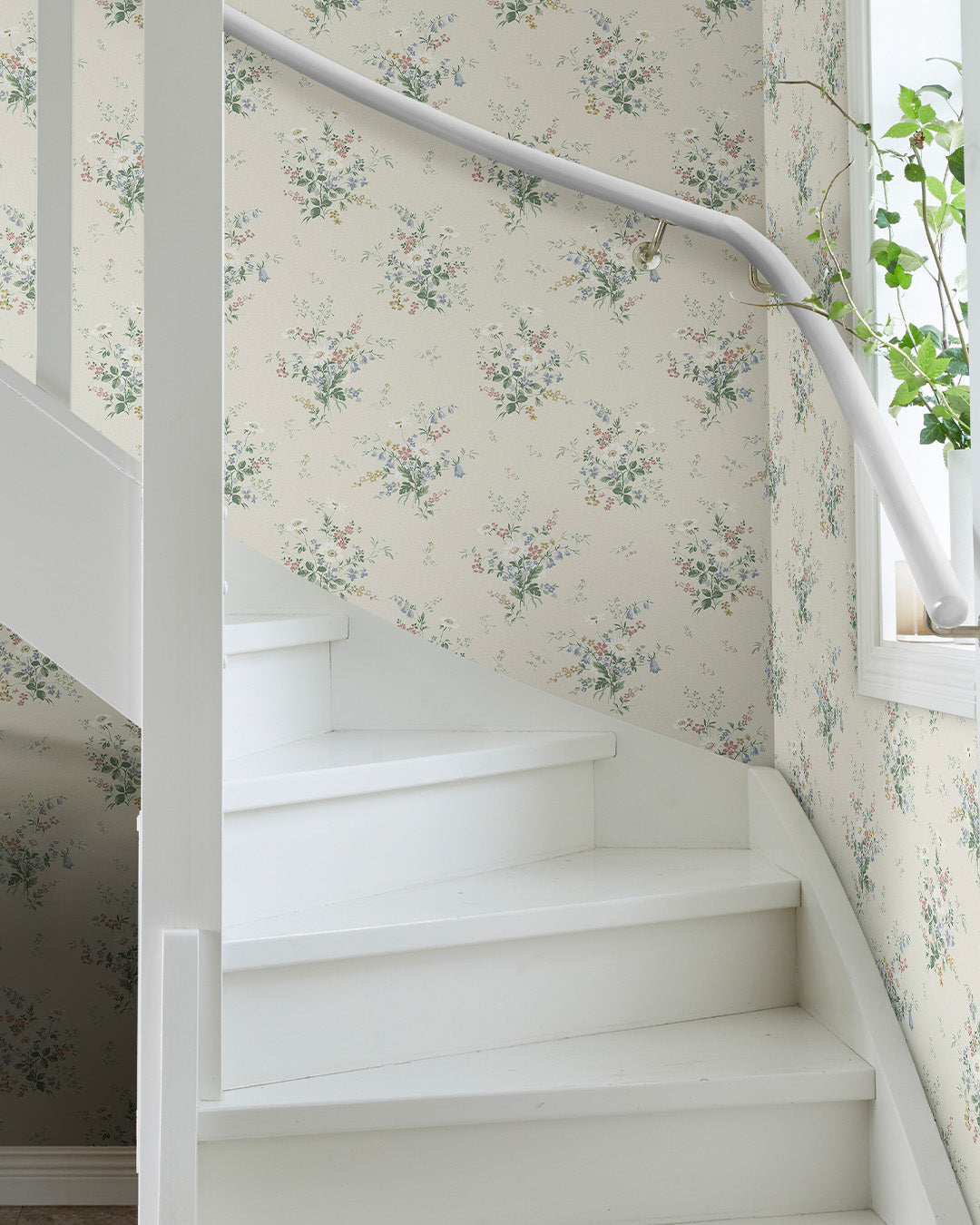 På en cremevit botten i tapeten Olivia dansar pigga buketter med vilda sommarblommor i mjuka nyanser av gråblått, gammelrosa, havre, vitt och grönt. Olivia skapar en förnimmelse av en ljummen sommar där ljuset aldrig tar slut. Där det sjuder av liv i naturen och doftar sött av blommor och blad.