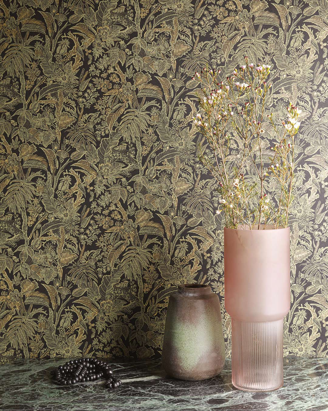 En grön och svart tapet där accenter pryds med subtil reflekterande guld. Detta detaljrika mönster vävs vackert samman med de gröna och gulguldiga mönstret och skapar nyfikenhet där du vid varje anblick kan hitta nya detaljer. Färgkombinationen ger lite tropiska vibes och gör sig bra i sovrum, kontor och matrum. Mönstret hittar du i 5 färgställningar.