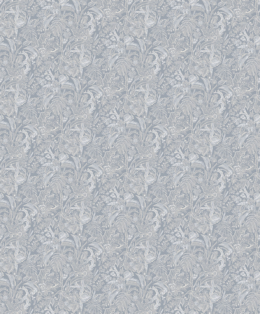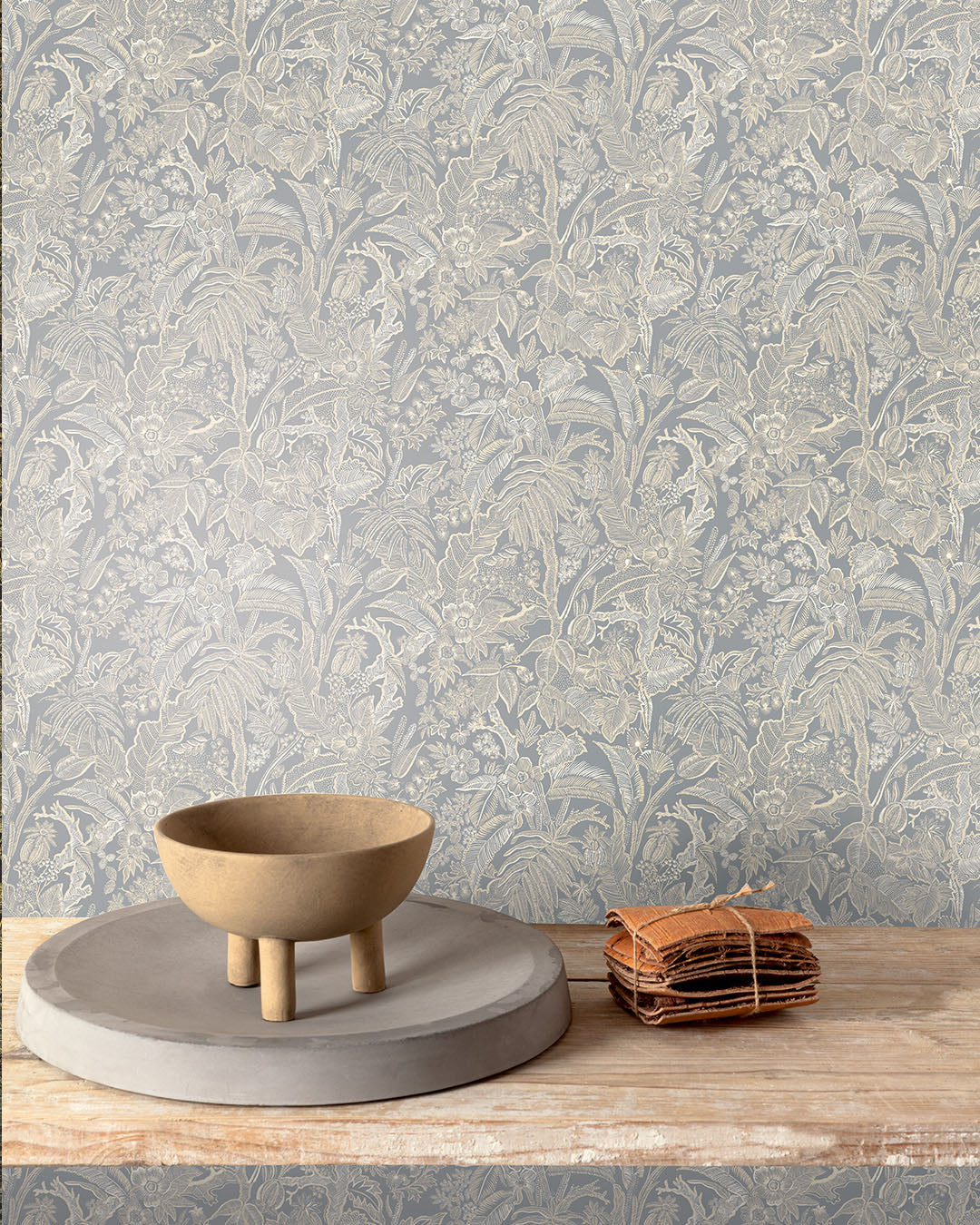 Mönstret Onikar är ett ljuvligt mönster med en linjeteckning av små blad och blommor, tillgänglig i blått eller grönt på en svart bakgrund, eller i vitt på en senap, silver, beige eller gråblå bakgrund. En gråblå tapet som gör sig bra både i sovrum, vardagsrum eller hall. Finns i 5 färgställningar.