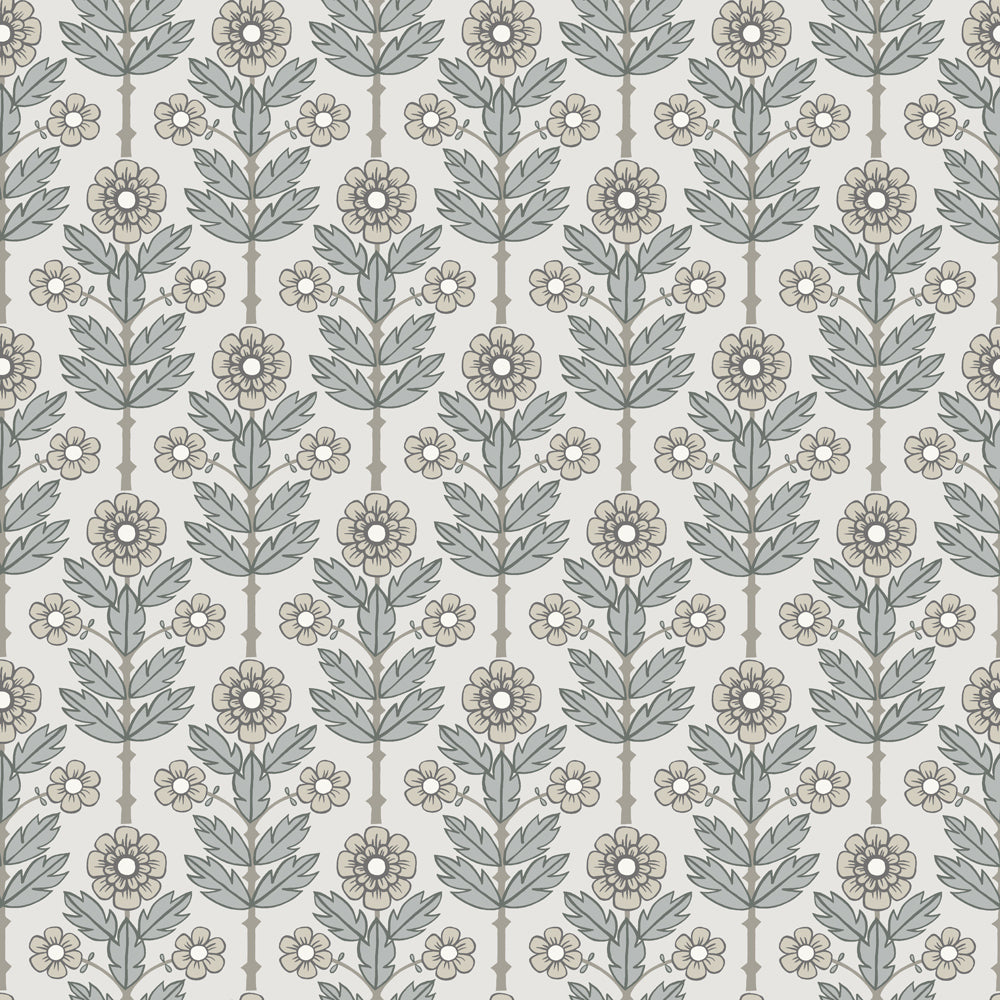 Ljus gammaldags tapet med blommor och blad i raka, lodräta linjer. Flera nyanser av milda toner i grått och beige samspelar för ett mjukt och neutralt intryck. Finns i 5 spännande färgställninga