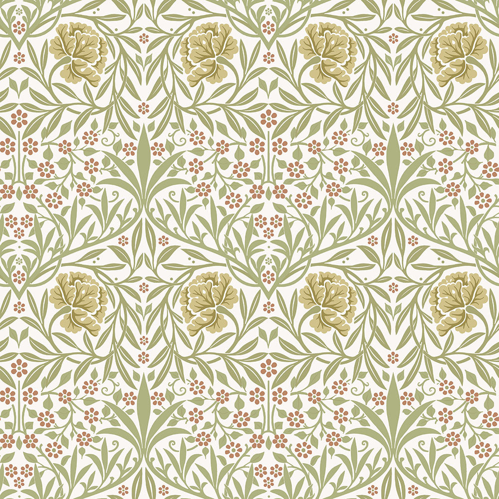 Förlora dig i vackra tapeten Oxford Union designad av William Morris 1876. Trots att det nästan är 150 år sedan mönstret skapades har denna tidlösa design en lika självklar plats i våra hem nu som då. På en naturvit botten förenas pilkvistar i mjuk grön nyans med roströda förgätmigej och havregula blommor med slingrande olivgröna stjälkar. Låt den omfamna dig och ditt hem.