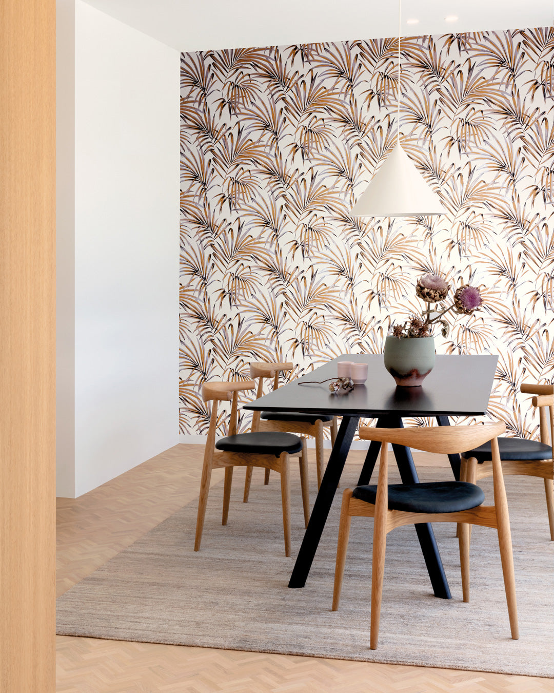 Den ljusa tapeten Palm Ginger pryds av eleganta palmblad mot en ljus botten. Exotiskt och expressivt, men också lugn och harmonisk för en skön, lyxig semesterkänsla i rummet. Tapeten trycks i åtta olika färgställningar. Här ser du palmbladen i skiftande nyanser av beige och svart mot ljus botten.
