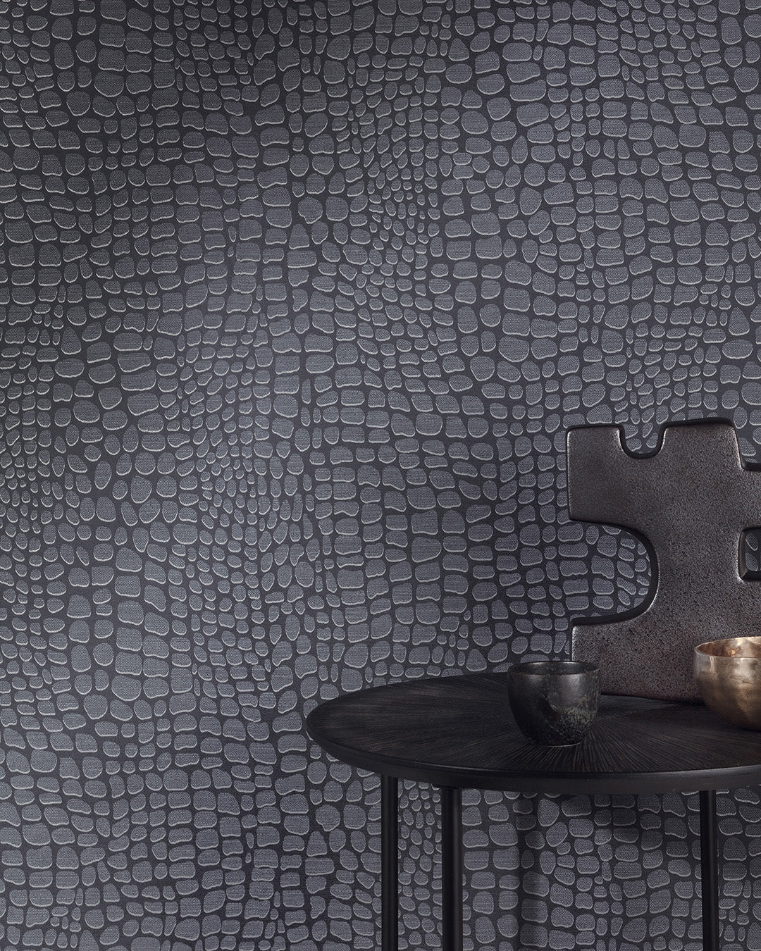 Tapeten Panthera Caviar kombinerar djup och struktur på ett elegant sätt. Det diskreta mönstret, inspirerat av djurmönster, ger en känsla av lyx och taktilitet samtidigt som färgskalan i skifferblått och grafit skapar en dramatisk men harmonisk bakgrund.