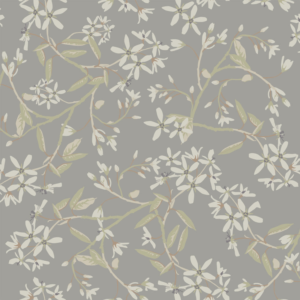 Som i en vacker dans förgrenar sig blommorna över väggen i tapet Paradis. På en dov grålila botten blomstrar kvistar i nyanser av beige, grönt, vitt och dämpad terrakotta. Tapeten omfamnar rummet på ett mjuk sätt, sätter sin prägel och kombineras fint med annan inredning.