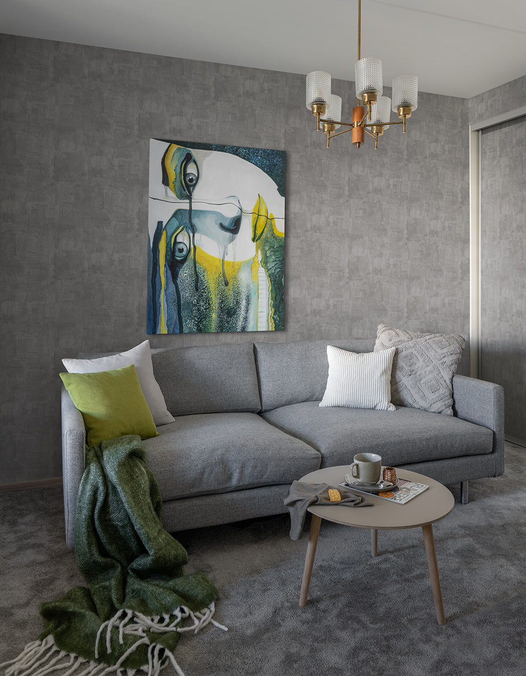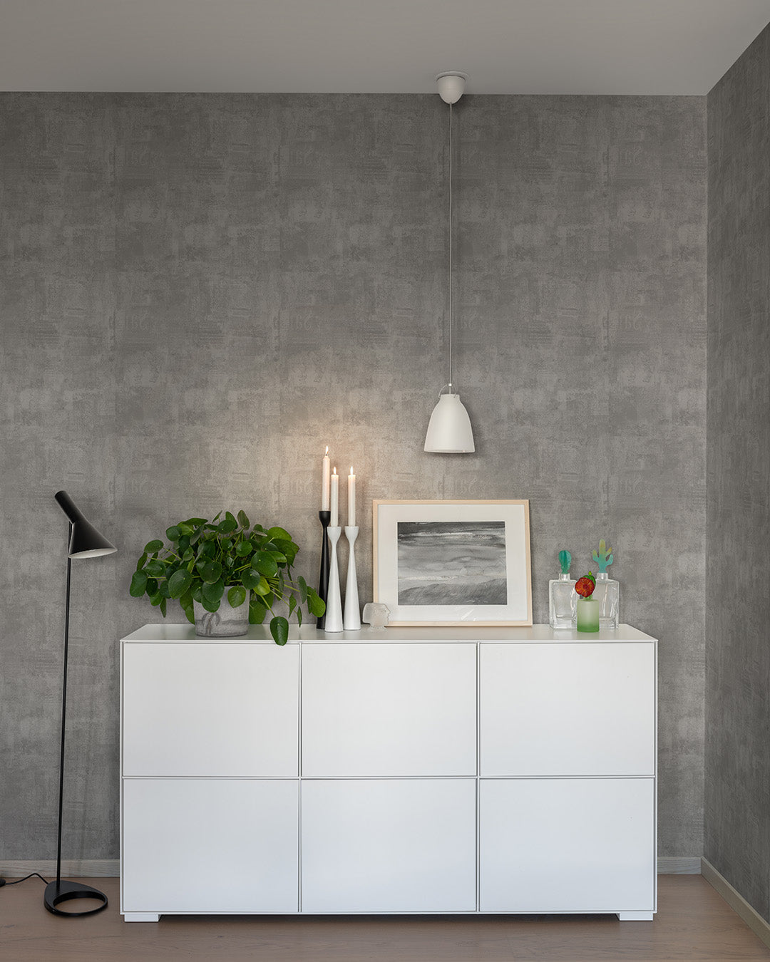 En grå cement tapet som har allt och lite till. Den skapar en mjuk följsam textur på väggarna som avger en industriell känsla utan att bli för kall eller hård. Lätta inslag av texter ger den karaktär och gör rummet ombonat och hemtrevligt.