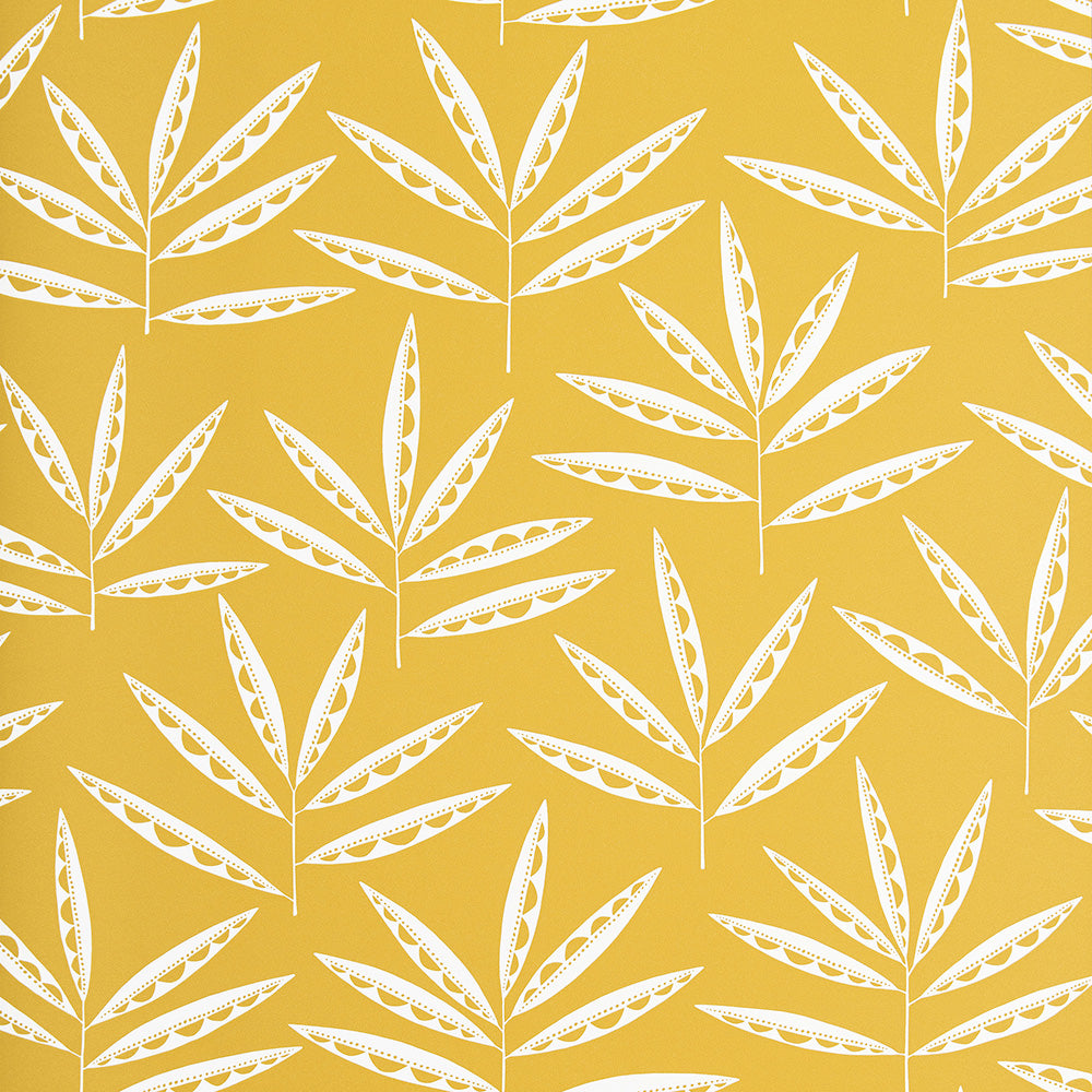 Ta in solsken och designglädje till ditt hem med tapeten Pea Pods. Förvandla dina mörka och tråkiga utrymmen med en handillustrerad senapsgul tapet med vita blad i retrostil. Denna tapet från MissPrint är tryckt med vattenbaserad giftfri färg samt fri från tungmetaller.