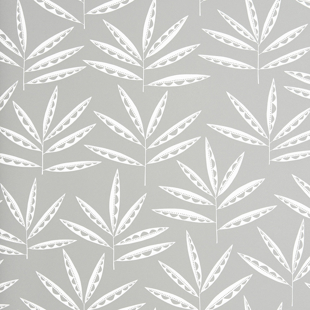 Fläktliknande blad strålar tryggt och energiskt utåt, samlar solens strålar och skapar nya frön av liv. Använd på dina väggar för att få in naturens liv i ditt hem. Grå tapet med vita blad i retrostil. Finns i fyra färgställningar.
