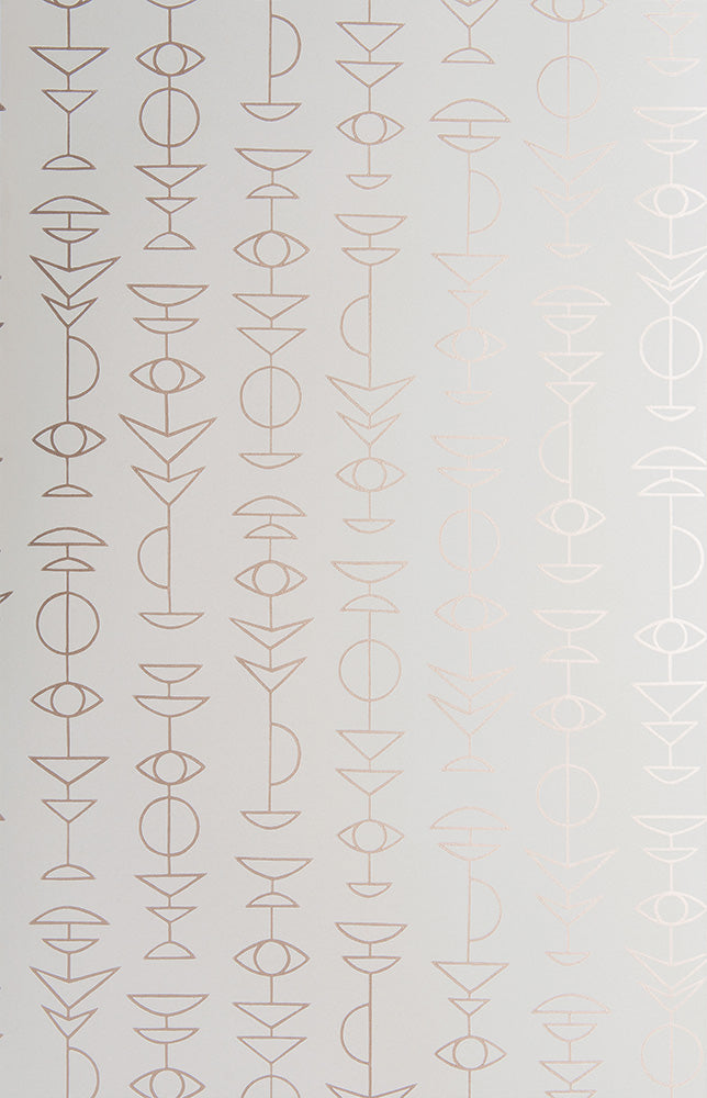 Ljus blågrå tapet med lodrätta hieroglyfer i roséguld. Det djärva grafiska mönstret framhävs av metalliskt bläck och den taktila finishen hos en rik yttrycksteknik. En modern tapet med forntida känsla, vi har kommunicerat med symboler och målningar i tusentals år. Låt dina väggar föra vidare traditionen.