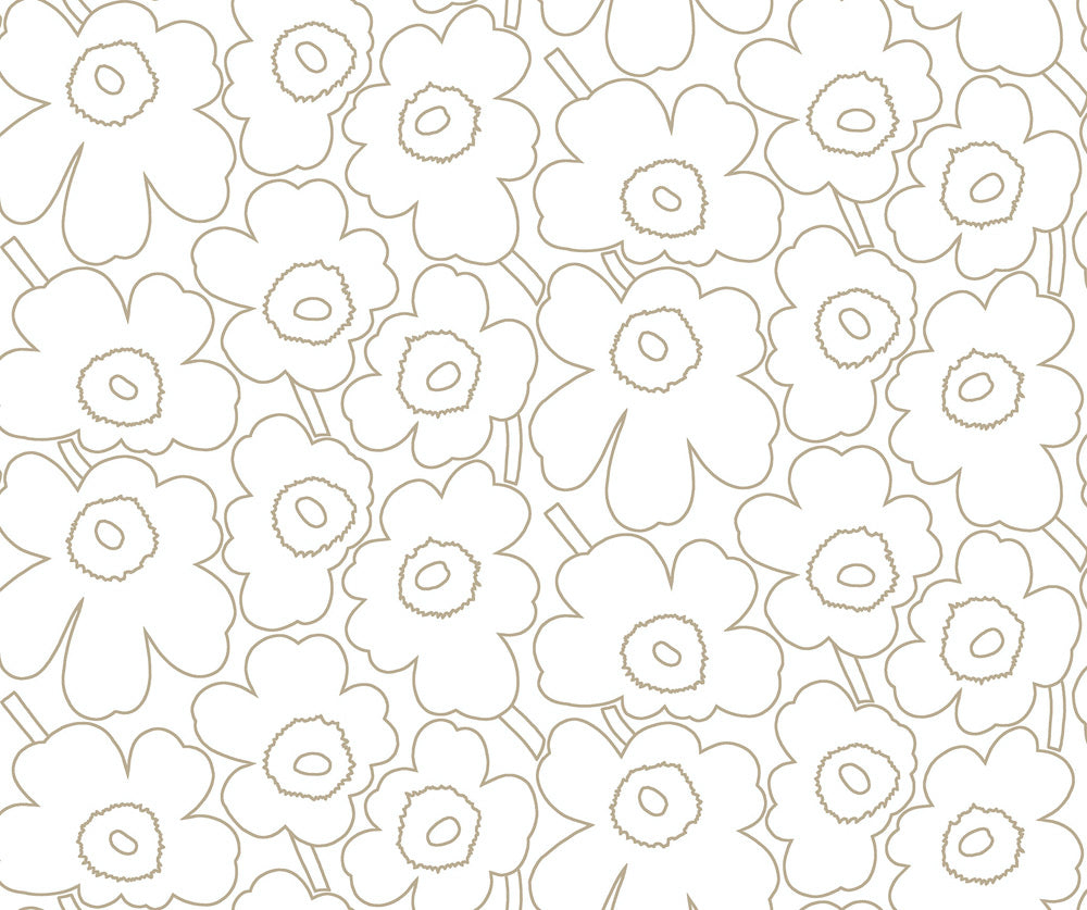 Tapet Piirto Unikko från Marimekko med vit bakgrund och blomkonturer i greige är en mjuk och sofistikerad tolkning av det välkända blommönstret. Den rena vita ytan skapar ett ljust och tidlöst intryck, medan de diskreta greige-linjerna en balanserad blandning av grått och beige ger blommorna ett subtilt och elegant uttryck. Färgskalan är neutral och harmonisk, vilket gör att mönstret smälter in på ett lugnt och stilfullt sätt utan att förlora sin grafiska identitet. Det är en tapet som tillför en känsla av modern enkelhet och passar utmärkt i rum där man vill ha en stillsam men dekorativ fond.