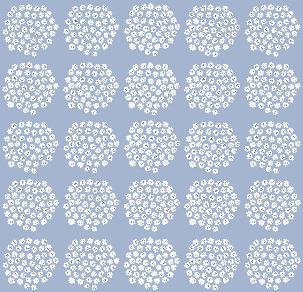 Annika Rimalas mönster Puketti (bukett) är ett av Marimekkos mest älskade blommönster. Här kombineras två typiska Marimekko-motiv, sfären och blommorna. I denna färgställning med blå botten smyckas av vita små blommor. Mönstret hittar du i 3 dämpade färgställningar.